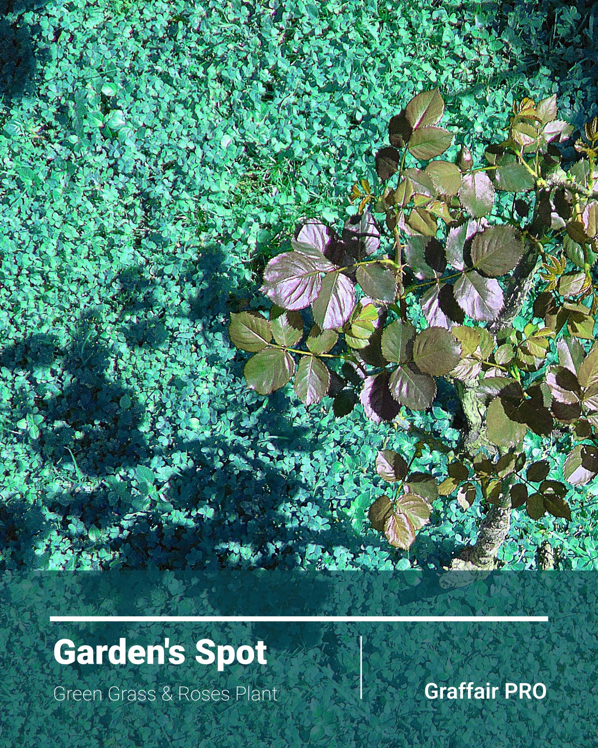 Garden's Spot: A photograph of a garden's spot with a rose plant shading the grass, captured with a bird's-eye view on a warm sunny day.
