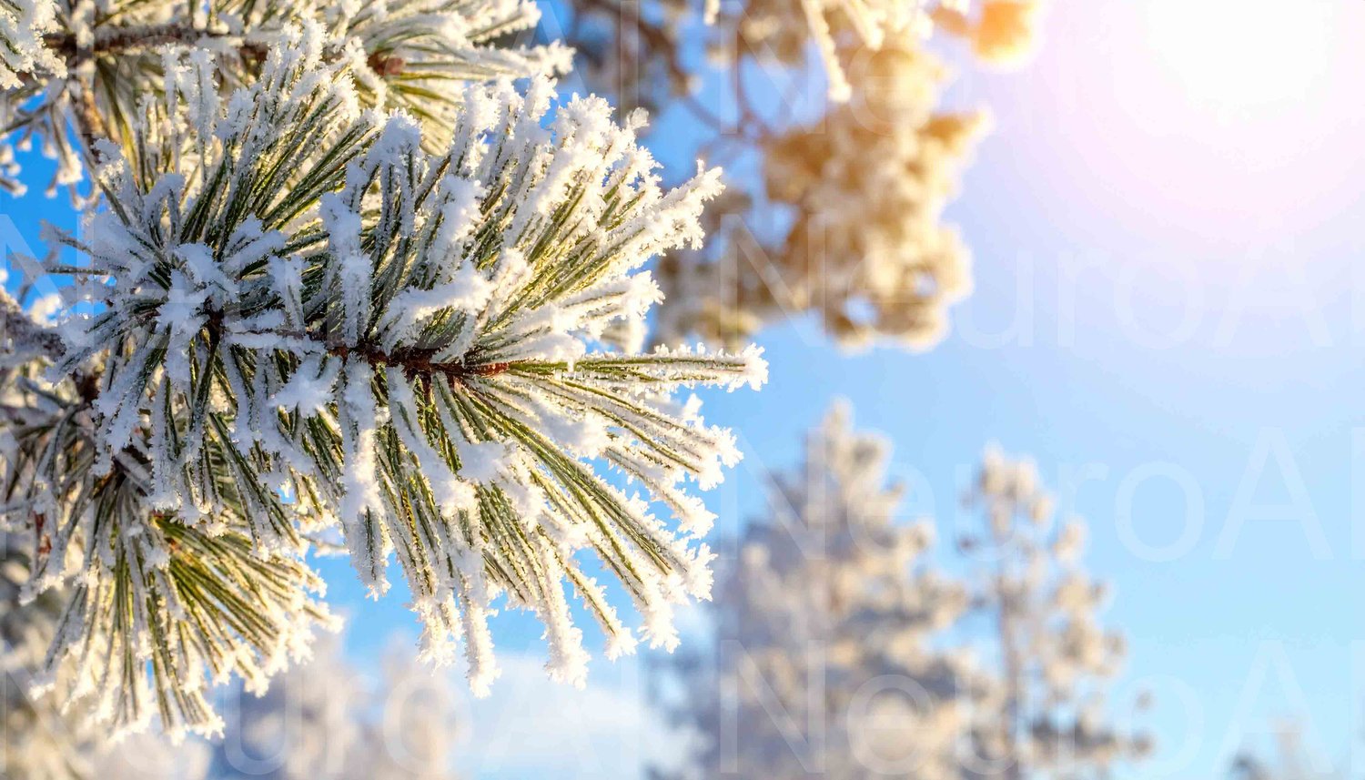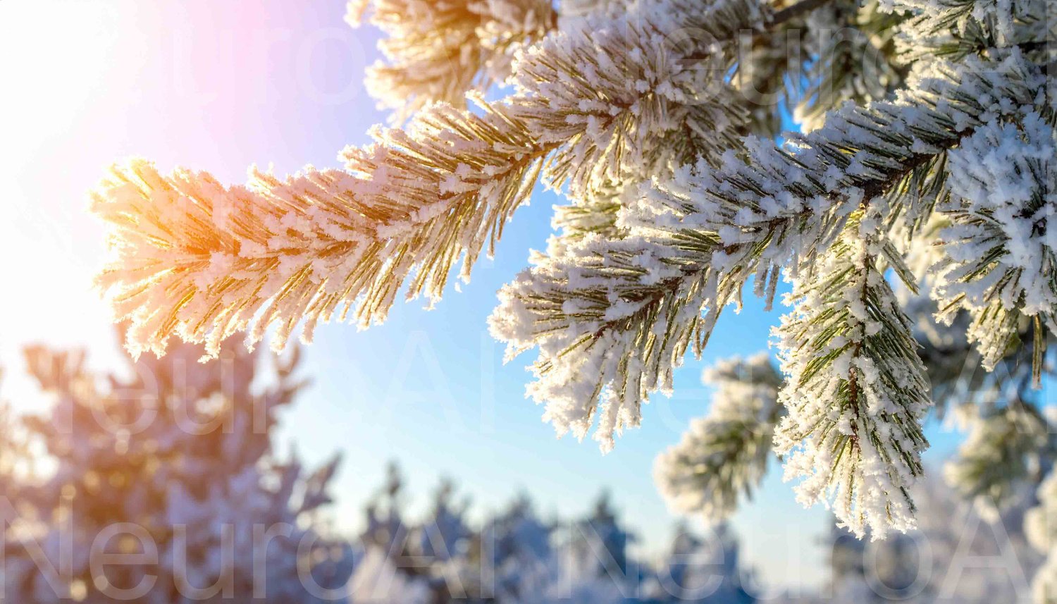 Snowy pine boughs glisten against a blue winter sky