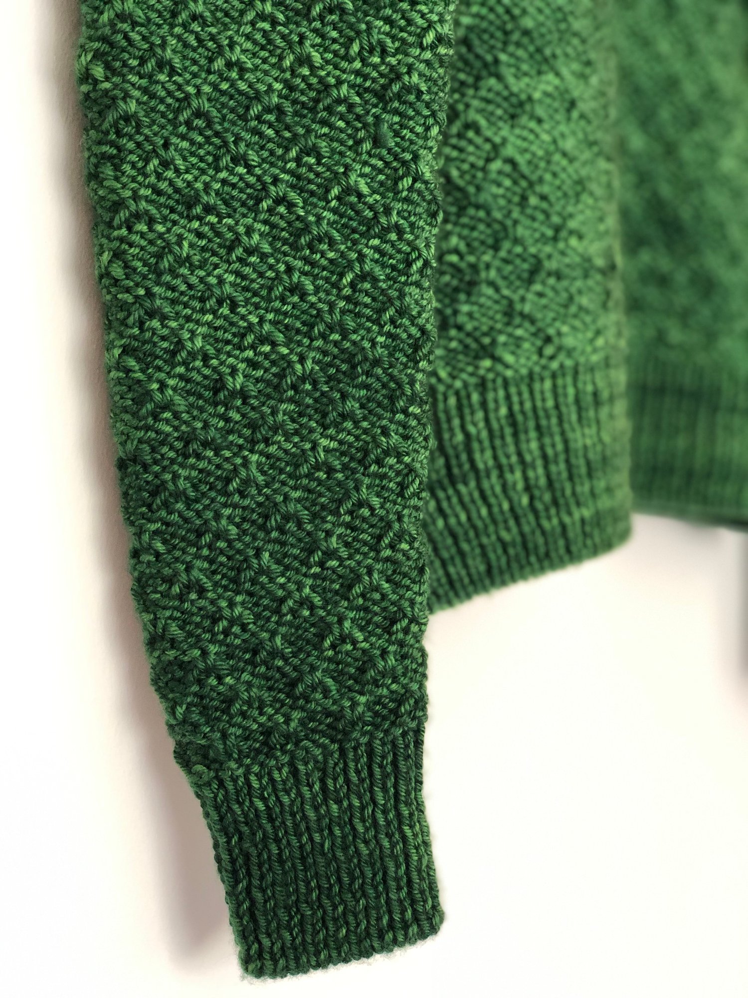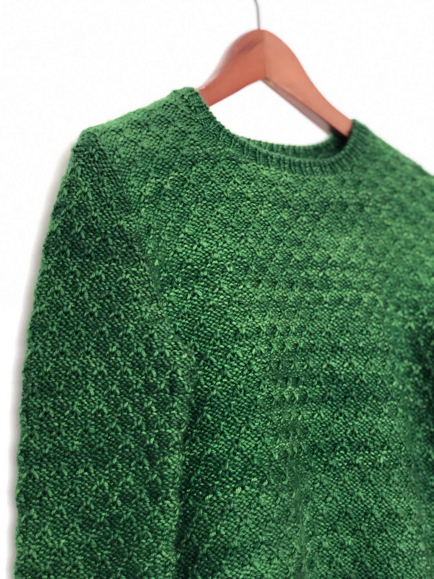 Jadeitite is a classic set-in sleeves sweater, worked in four pieces, a front, a back and two identical sleeves. All the pieces are worked flat from the bottom edge upward to the neck. Pieces are seamed together in the end, then the neckband is picked up.