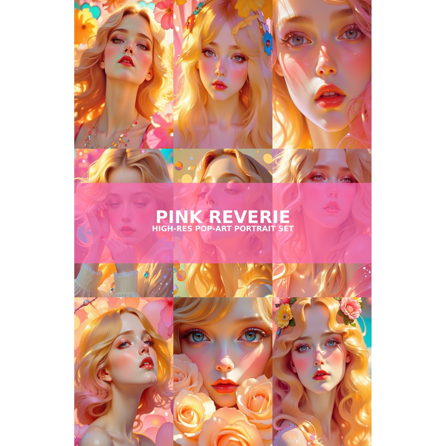 Bring a burst of dreamy color to your creative toolbox with Pink Reverie—a premium suite of nine (9) 3000 × 4000 px portraits inspired by retro pop-art palettes, modern beauty photography, and candy-bright nostalgia. Each image features a luminous blonde muse bathed in soft pinks, peaches, and golden highlights—perfect for anyone who craves vibrant, ultra-clean visuals that feel equal parts playful and sophisticated.