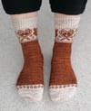 - designed for fingering weight (approx. 400-420 m / 100 g) yarns: approx. 20-30 grams of colour 1 (pale brown) and 50-70 grams of colour 2 (gingerbread brown)