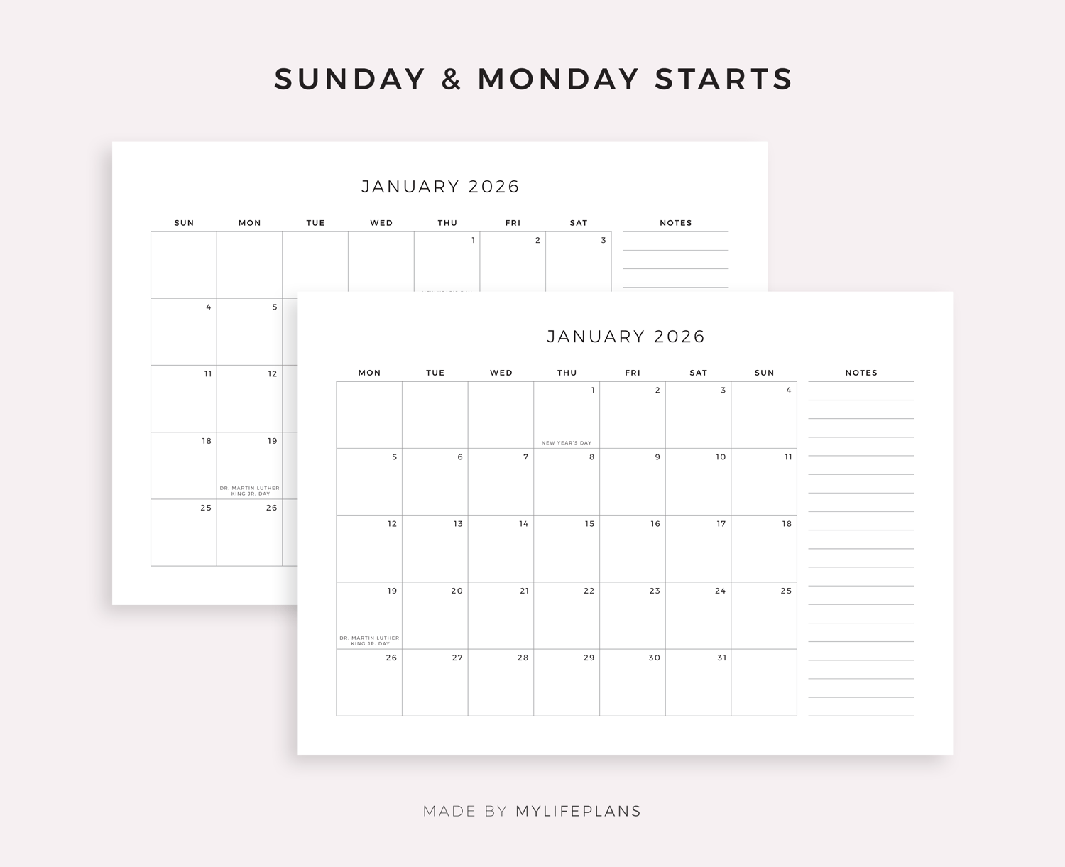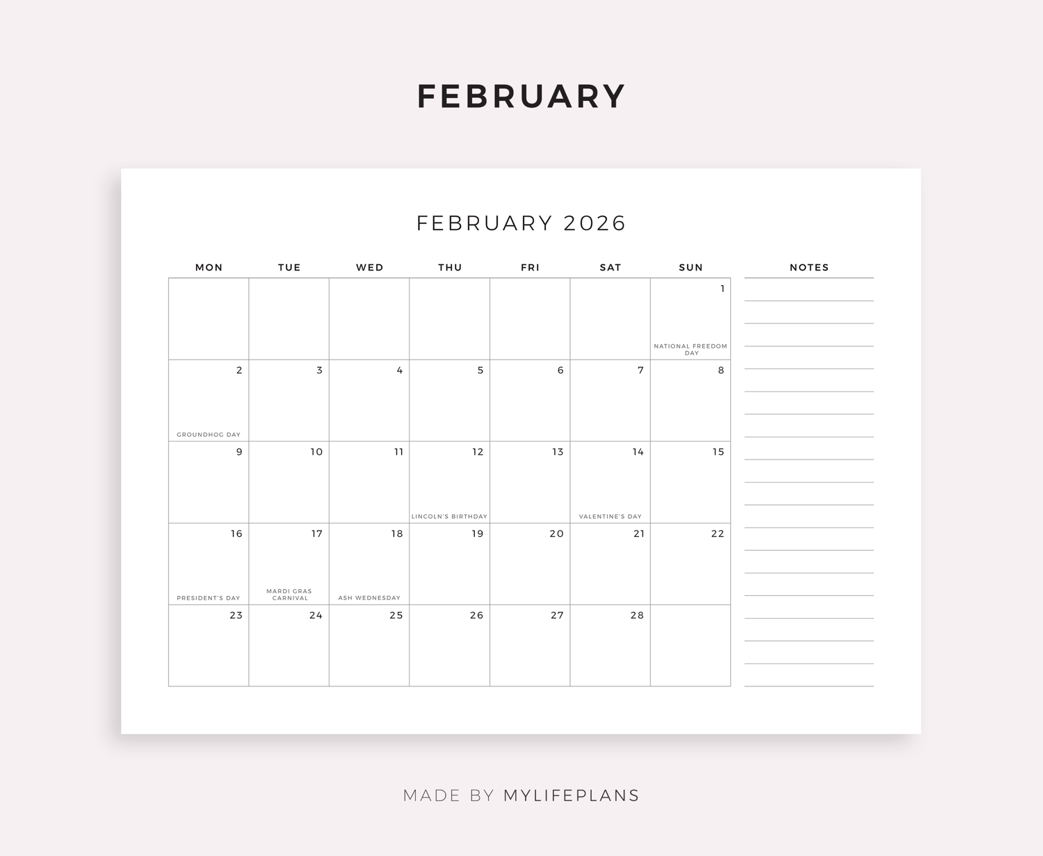 2026 Monthly Planner with Holidays, A4/Letter Size, Landscape, Printable & Fillable