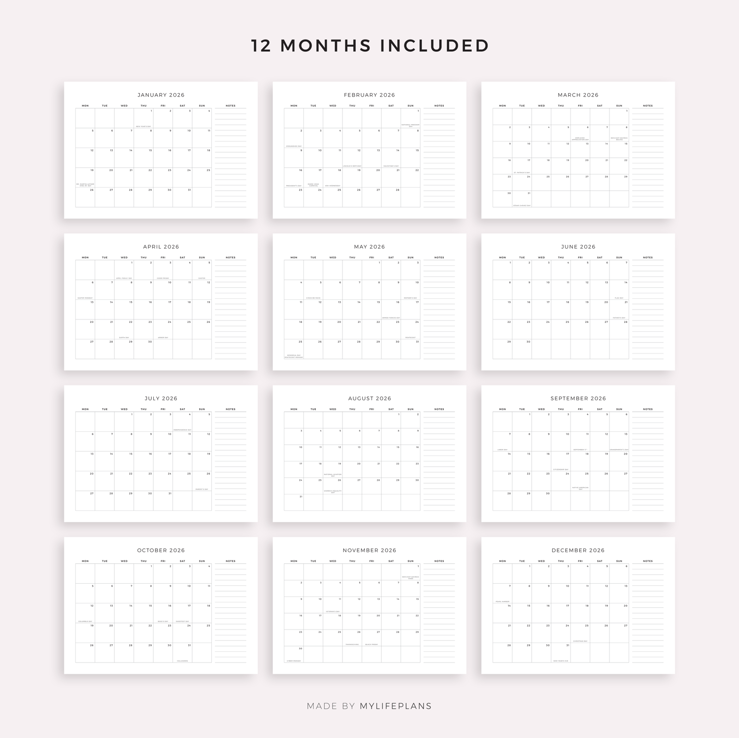This is a printable 2026 monthly planner with holidays — just download, print, and start using it right away.