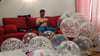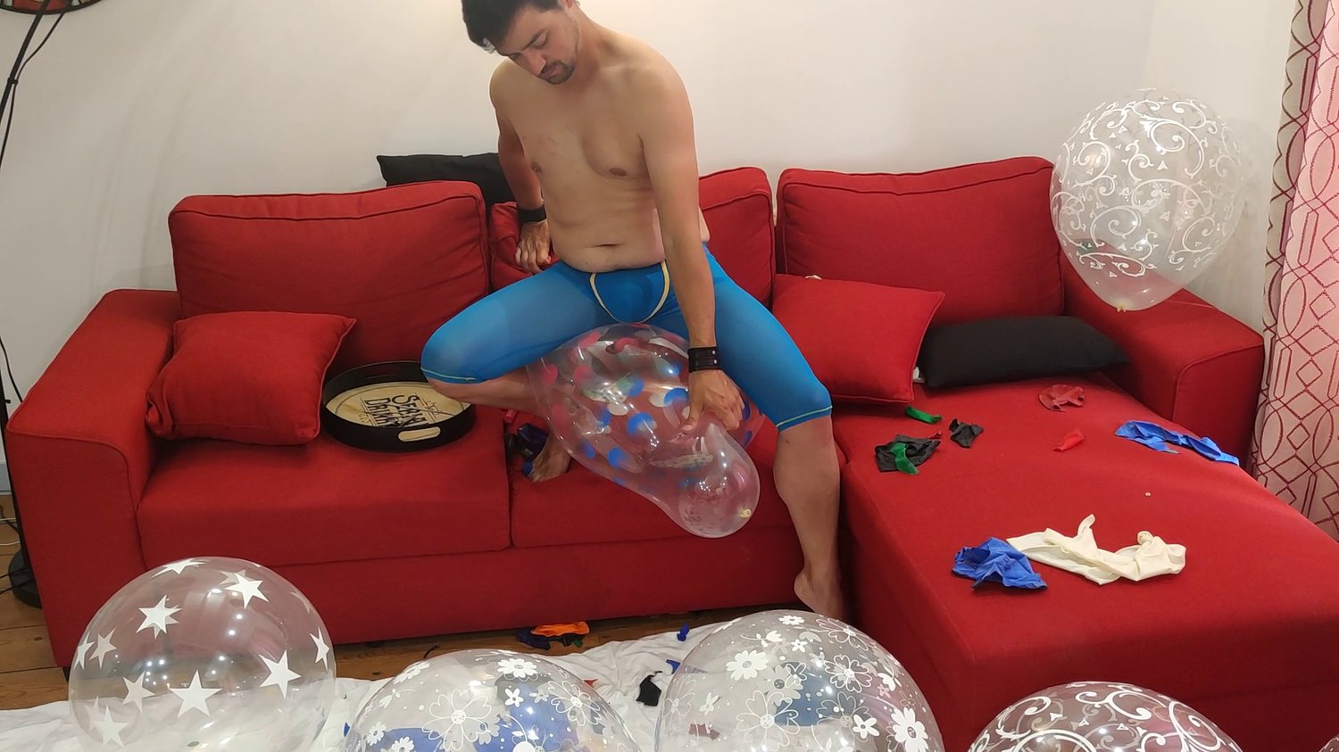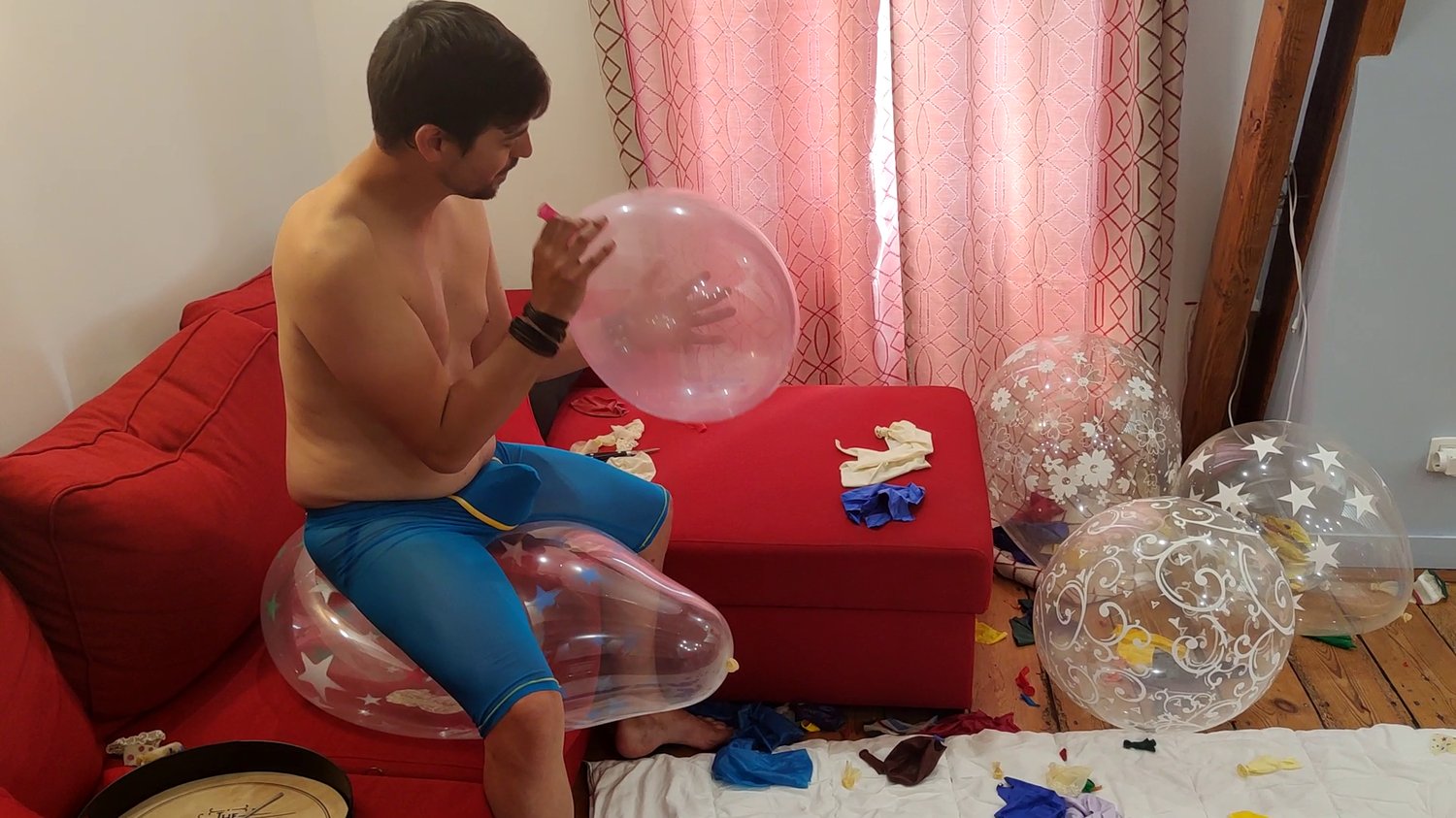 For his second vidéo Cédric blow and pop crystal and clear balloons.