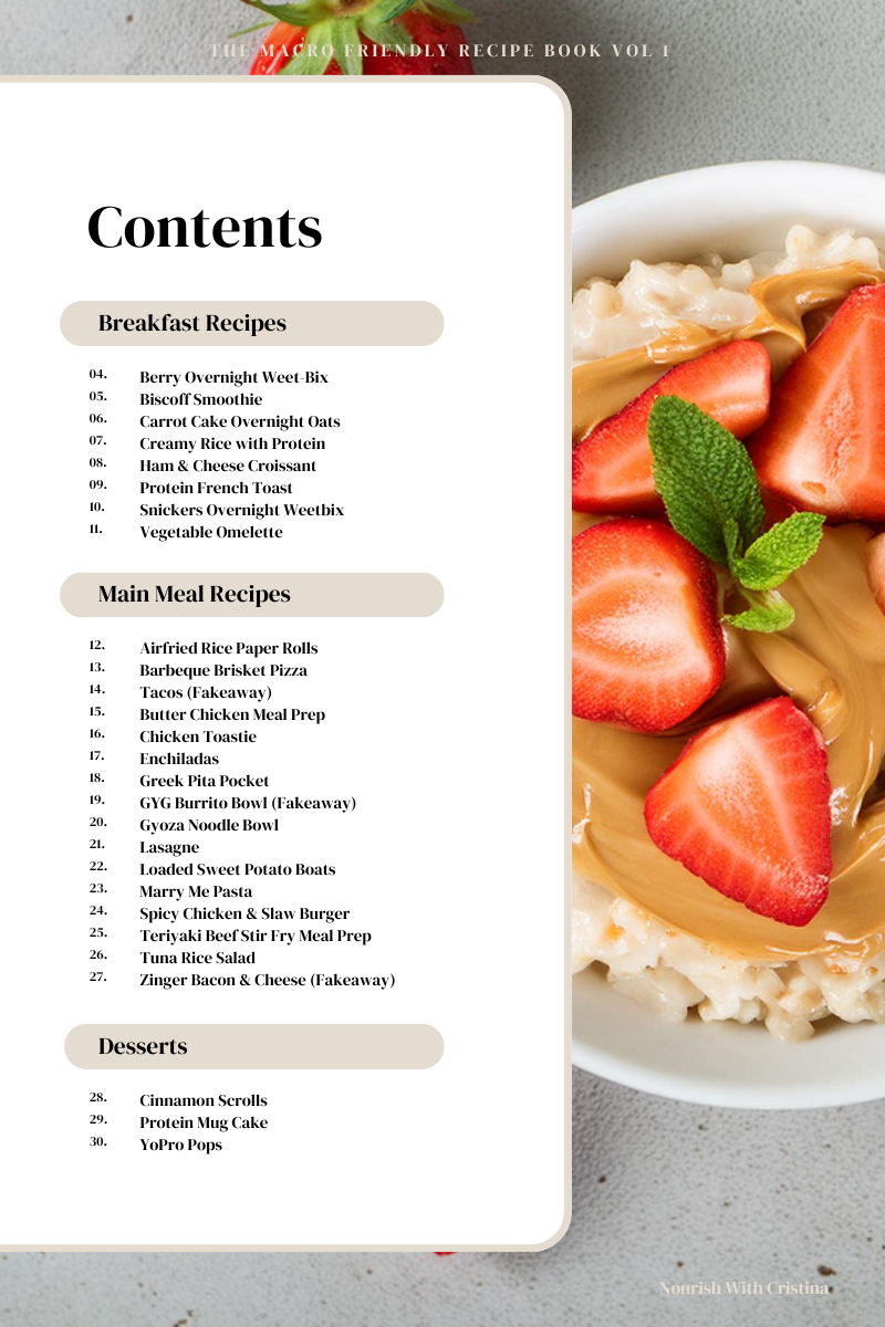 - 27 macro friendly recipes (breakfasts, mains and desserts)