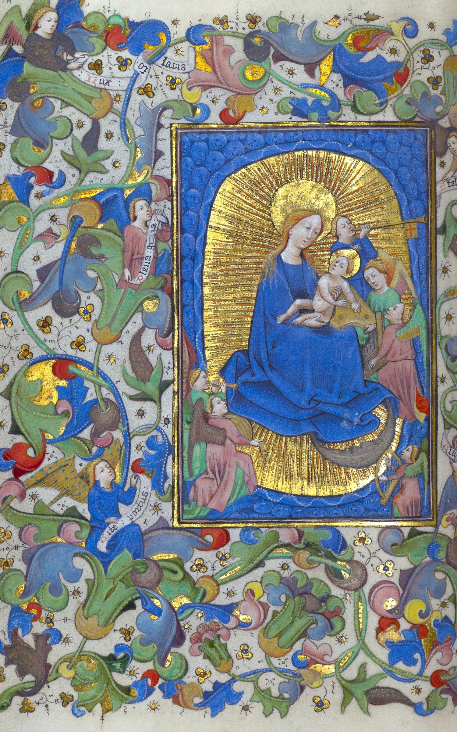 A luminous detail from a 15th-century illuminated manuscript, featuring the Virgin and Child surrounded by angels and radiant gold. The intricate border and deep lapis blue background make this one of the most striking designs in our Medieval High Tech Collection.