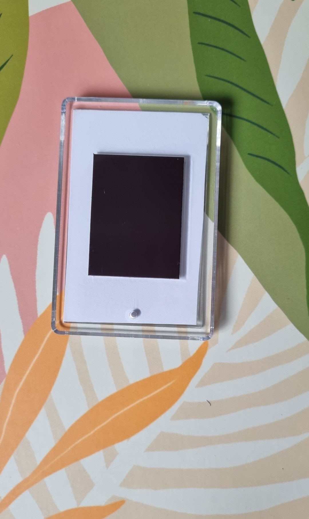 The design is printed on high quality glossy card, which is cut to size and put into a hard clear plastic case with a rectangular magnet attached to the back, so it can be displayed on your fridge, freezer, washing machine or anything that is made of metal of your choice.
