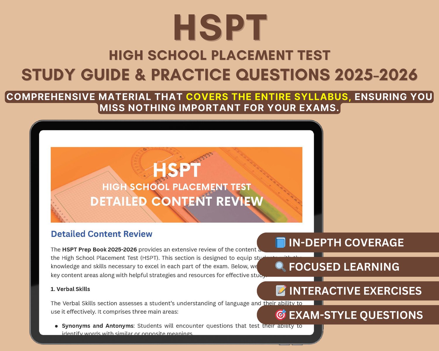 β In-Depth Content Review: Dive deep into every HSPT subject, from Verbal Skills to Quantitative Reasoning.
