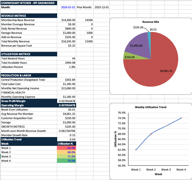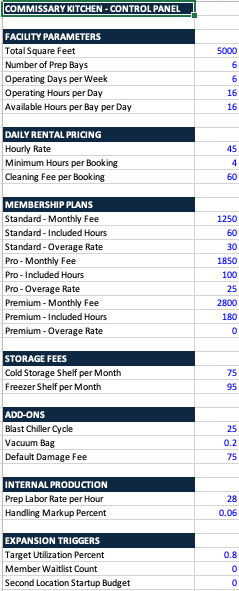 This 22-sheet system covers member billing, bay scheduling, accounts receivable, health compliance, production tracking, and a full expansion model for growing your operation. Works for commissary kitchens, ghost kitchen facilities, shared-use commercial kitchens, and food incubator programs.