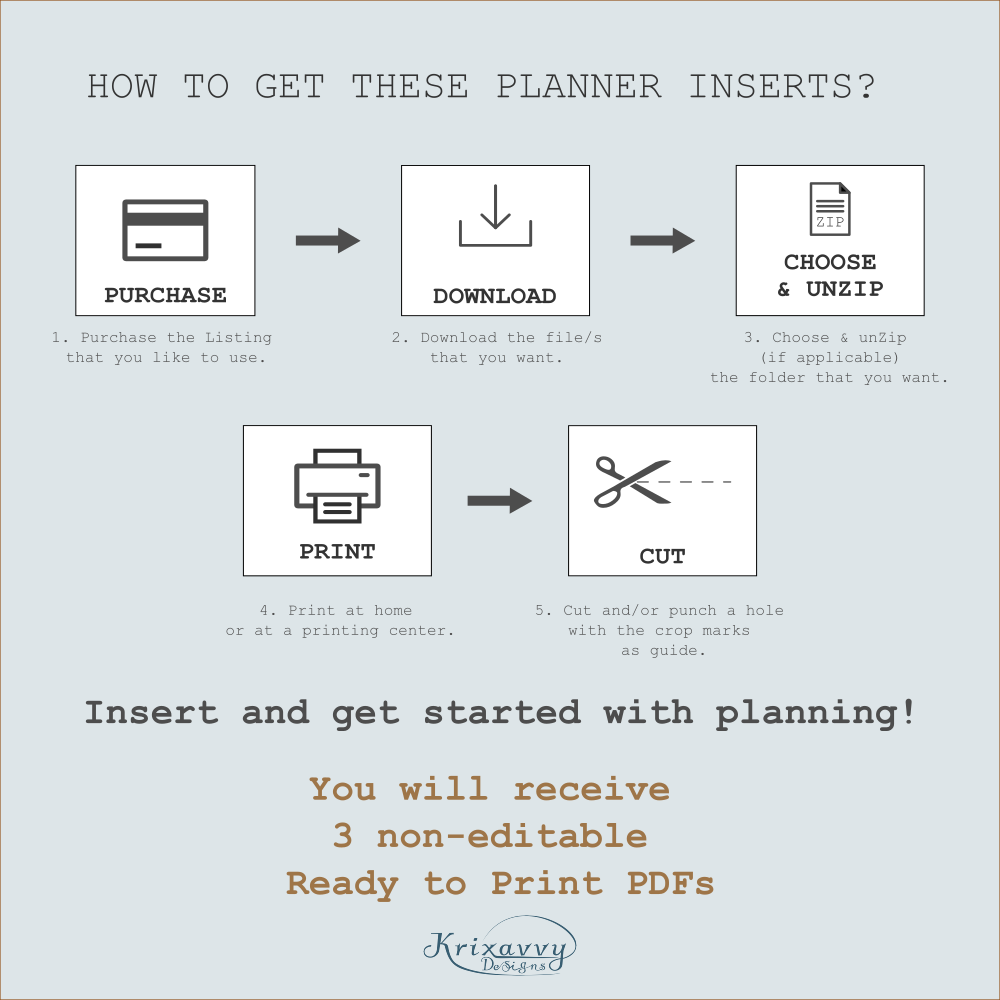 - Cut the planner inserts using the crop marks as guide. Punch holes and insert in your favorite PERSONAL SIZE binder.