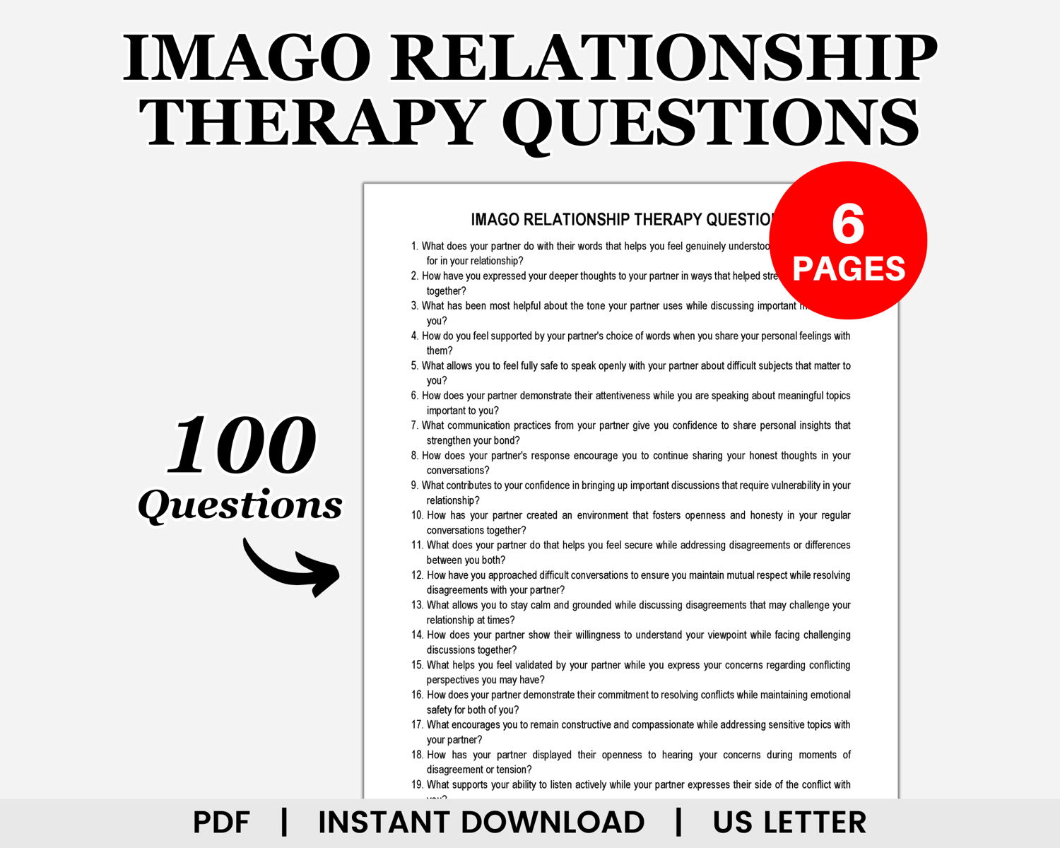 Designed to enhance client engagement and drive positive change, this therapy resource offers a collection of imago relationship therapy questions. Tailored to the principles of imago theory, these therapy questions will guide your sessions towards productive conversations and transformative outcomes. These imago relationship therapy questions are made to elicit insightful responses and encourage clients to explore their goals and aspirations.