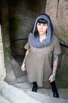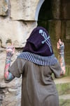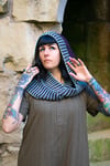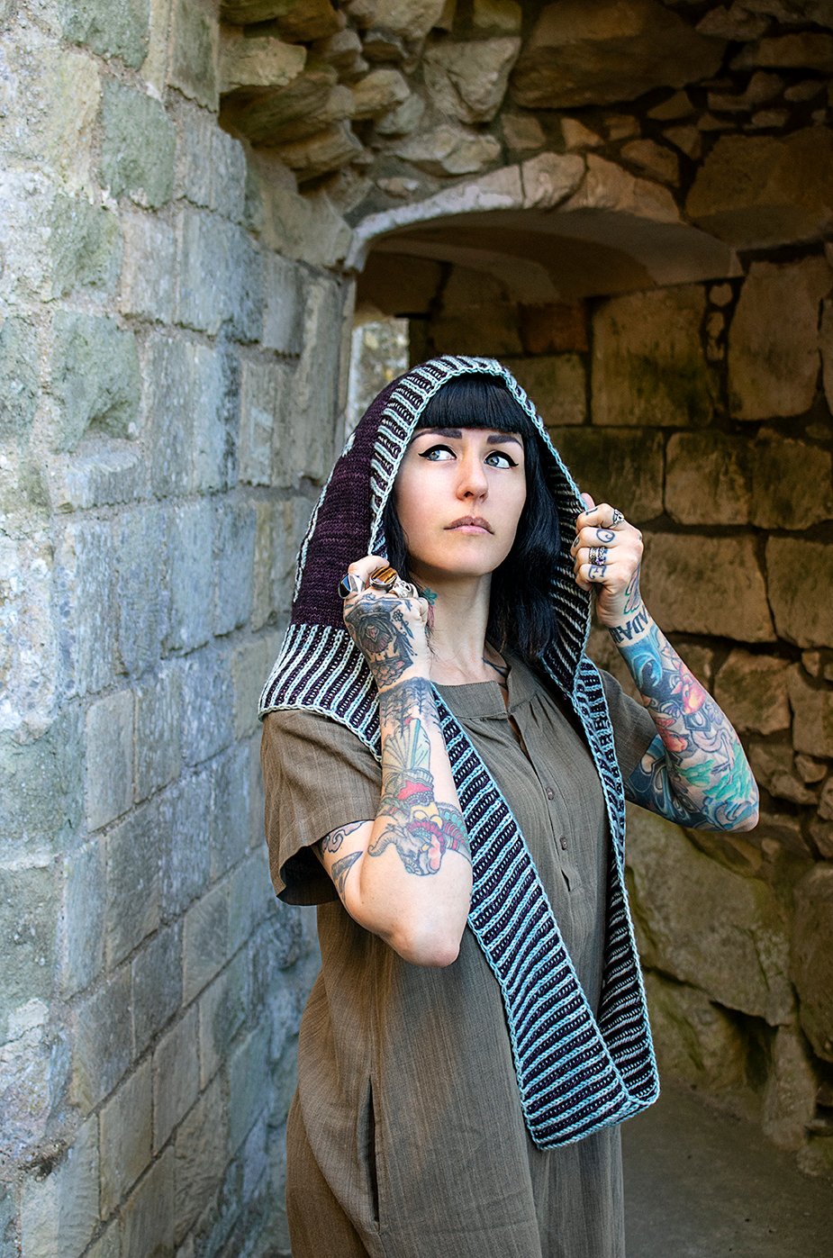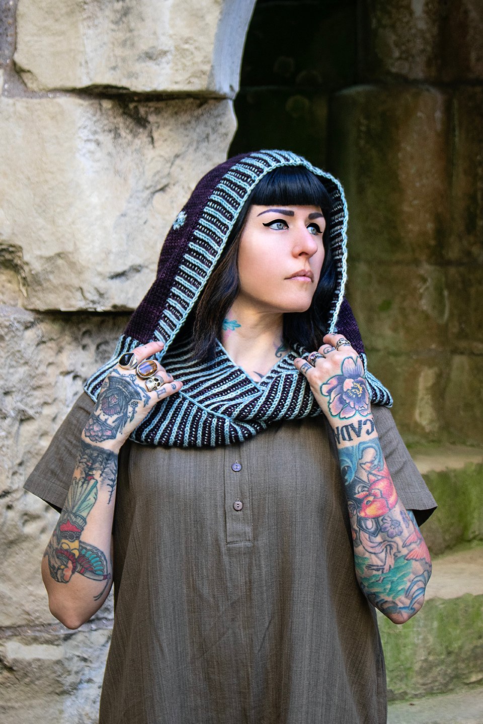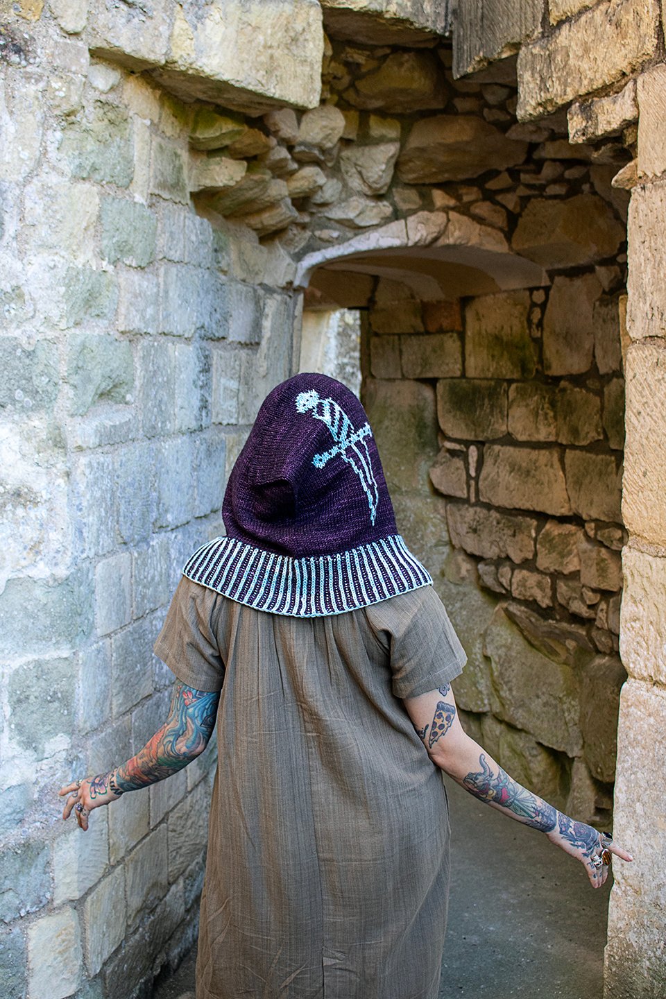 This hooded cowl is knit from the shoulders up to the crown and features a dagger created with faux intarsia. Two color brioche along the front edge, as well as the attached infinity scarf, bring everything together for a medieval themed accessory that also remains modern and functional.