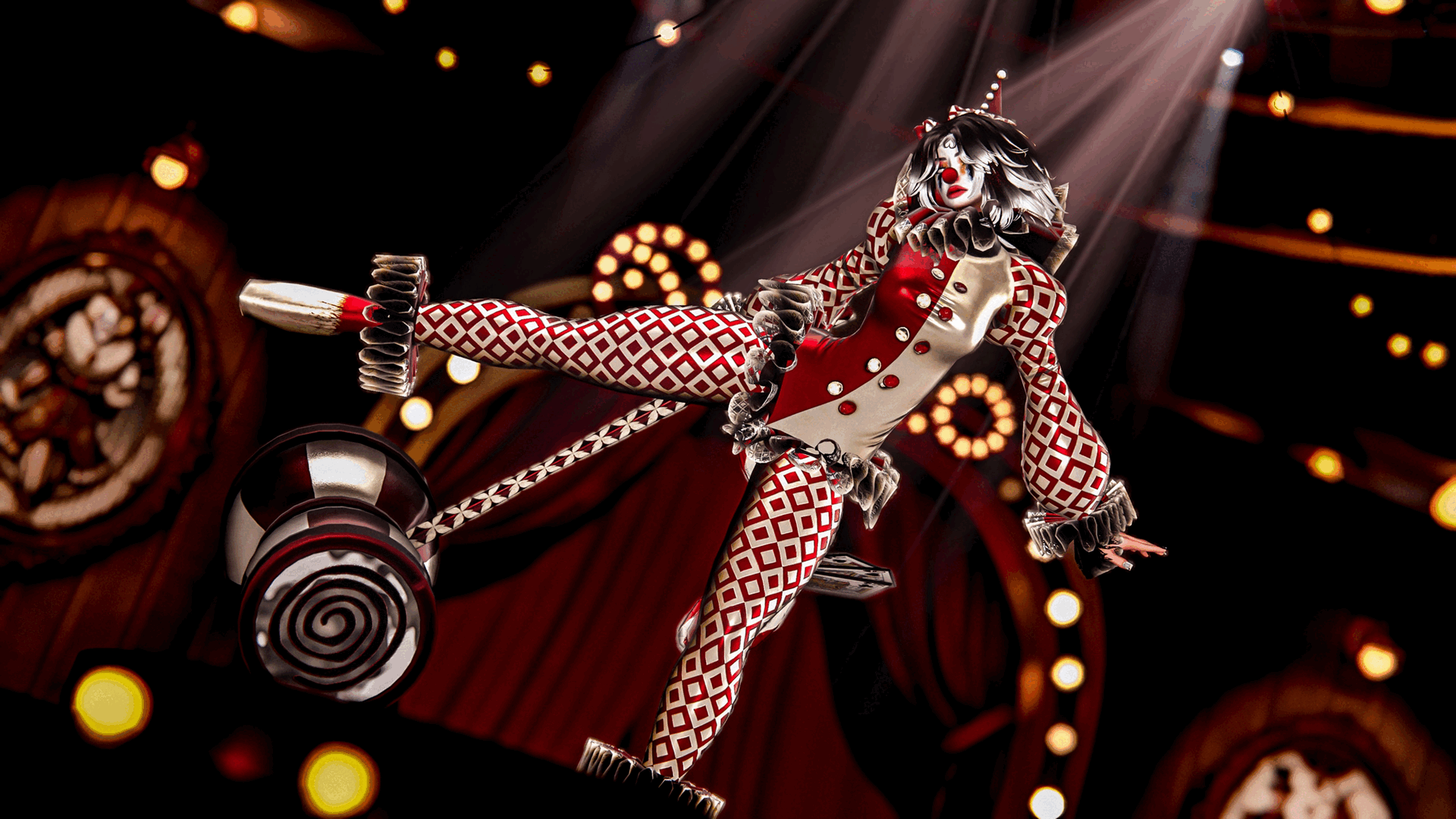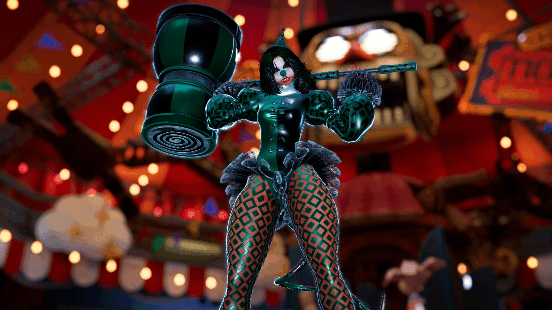 Clown Face Textures, Bodysuit, Ruffles, Stockings, Heels, Hammer, Face Mask, Cone Hat, Clown Nose, Hair Bow, Card Tail, Nails