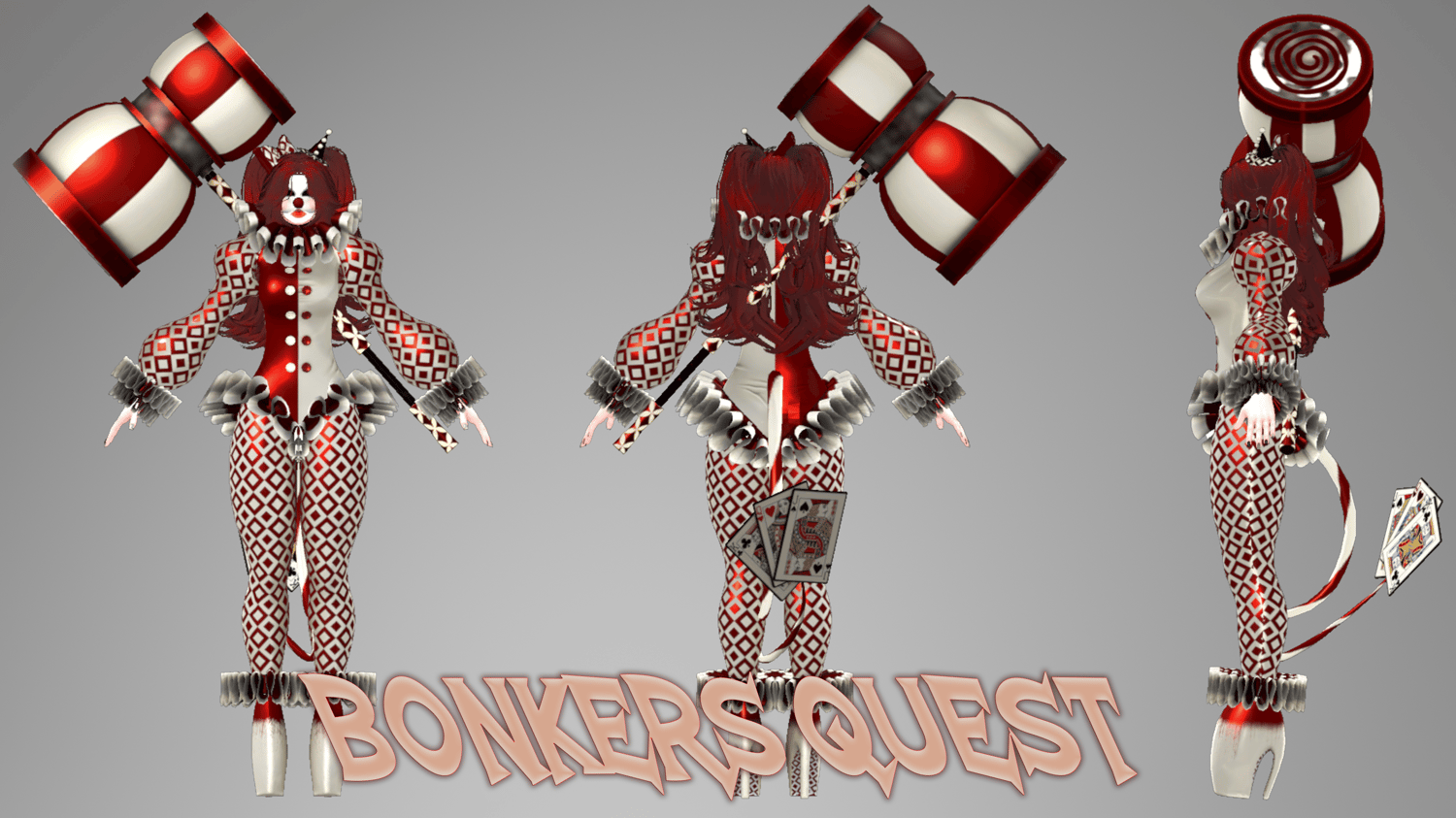 Clown Face Texture, Bodysuit, Ruffles, Stockings, Heels, Hammer, Face Mask, Cone Hat, Clown Nose, Hair Bow, Card Tail, Nails