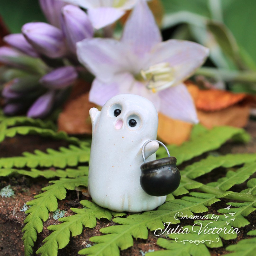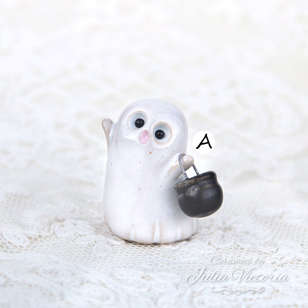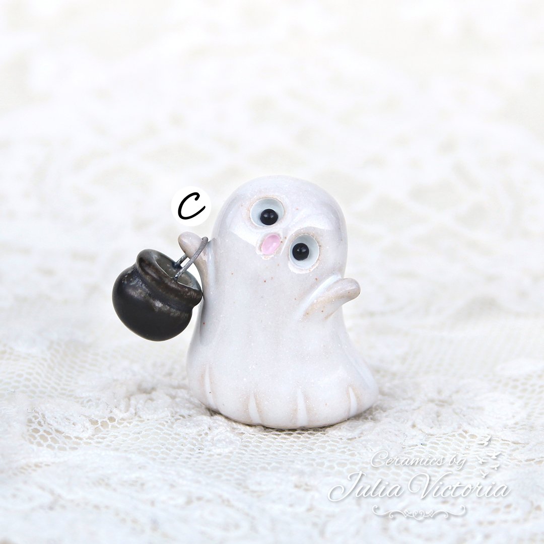 These cute little ghosts are looking for new homes to haunt. They are hand-sculpted in ceramics, glazed and painted by me