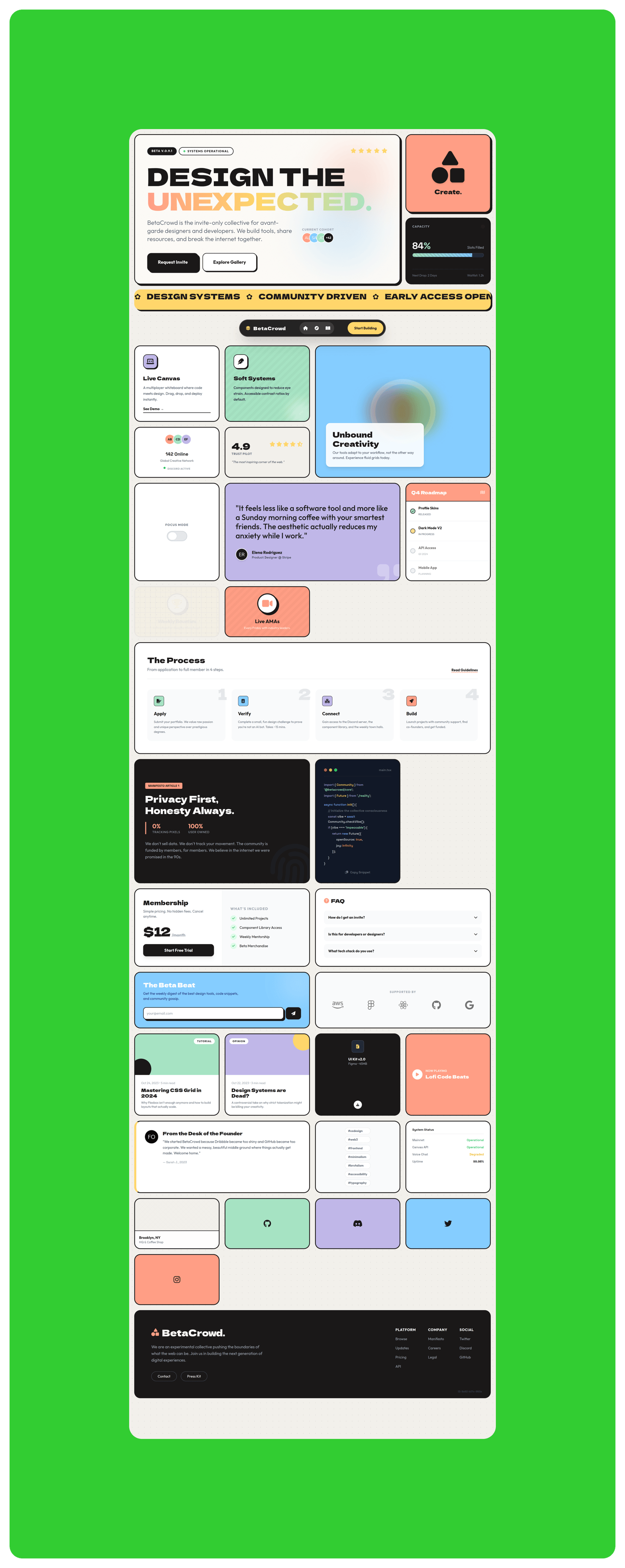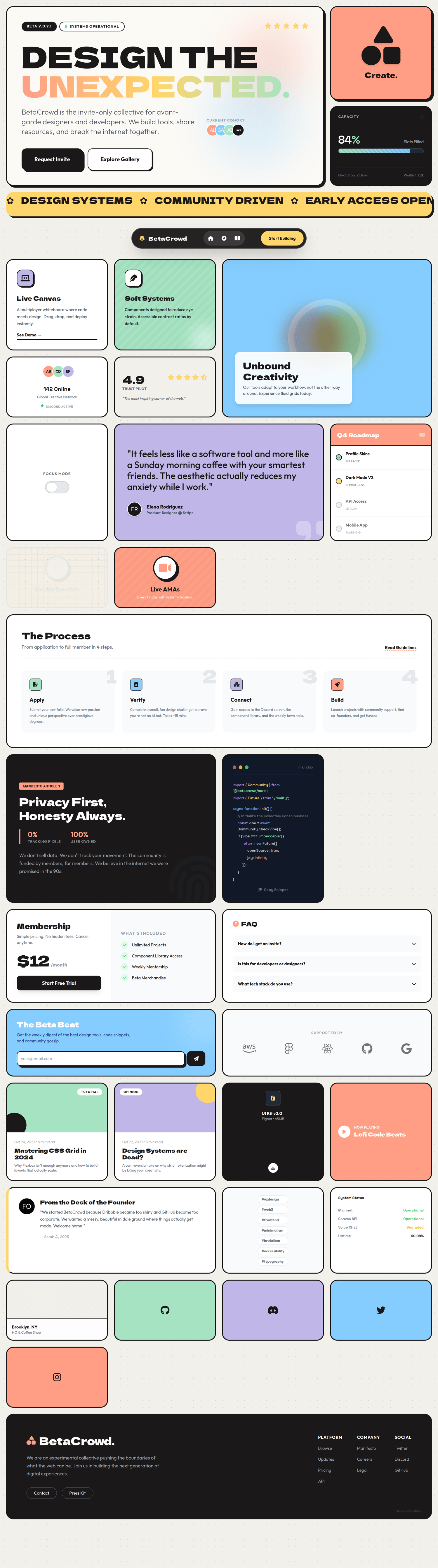 BetaCrowd gives you a stunning multi-section bento layout with animated blobs, bold headers, and modern grid-based storytelling. Perfect for creators launching communities, membership groups, or design-first platforms.