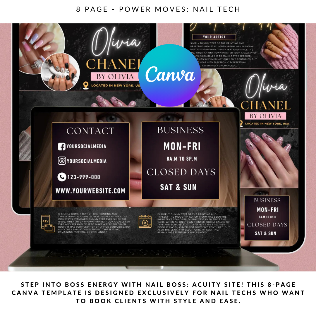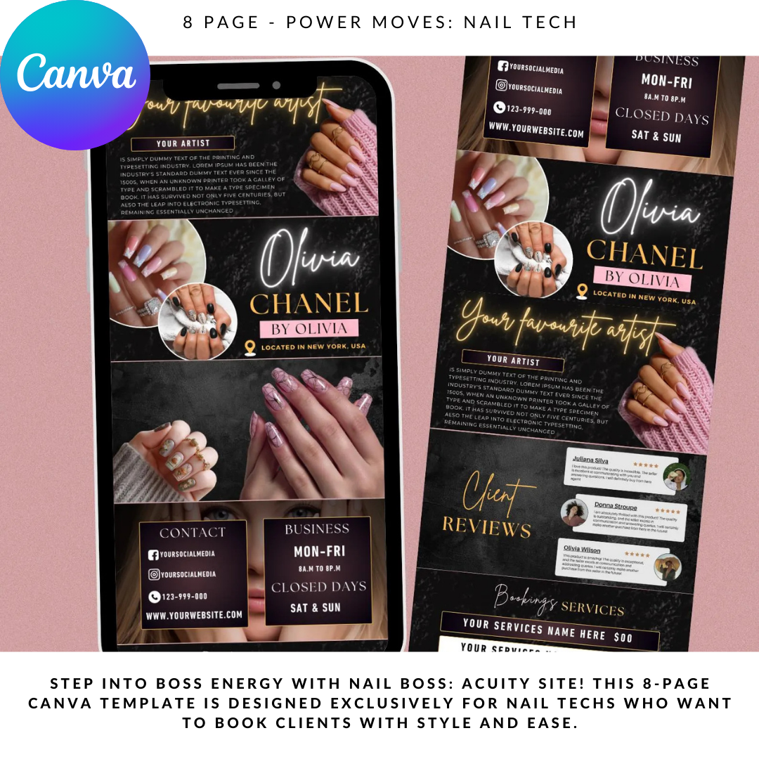 Step into boss energy with NAIL BOSS: Acuity Site! This 8-page Canva template is designed exclusively for nail techs who want to book clients with style and ease. From showcasing your services to creating a seamless booking flow, this site template helps you look polished and professional.
