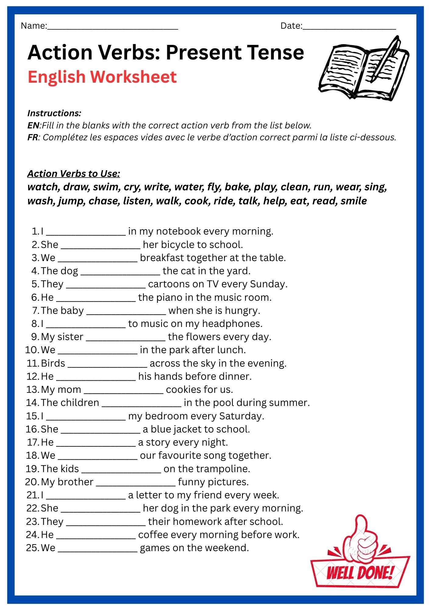 This worksheet is specially designed for French-speaking learners of English. It features 25 fill-in-the-blank sentences to practice common action verbs in the present tense. The activity comes with bilingual instructions (English & French) to support beginner to elementary-level students (A1–A2 CEFR level).