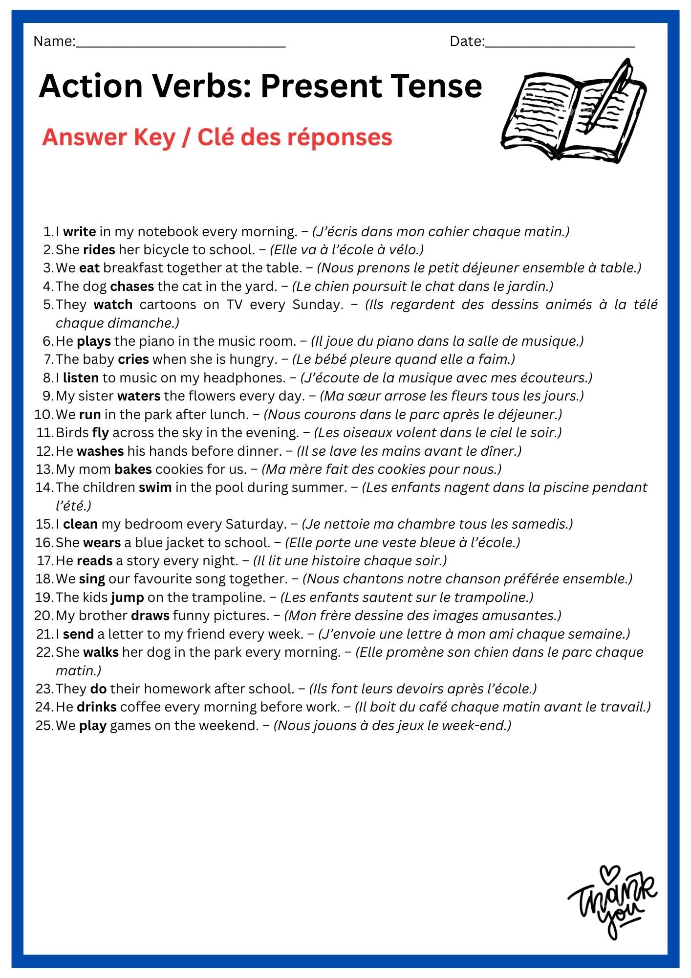 Action Verbs – Fill in the Blanks (25 Sentences) – ESL Worksheet for French Students + Answer Key