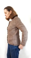 Knit from the bottom up with raglan decreases at the shoulders, this seamless cardigan includes waist shaping instructions. The sleeves are worked separately to the armholes and then joined to the body. The finished, blocked sweater is meant to be worn with 0-3” / 0-8 cm of positive ease.