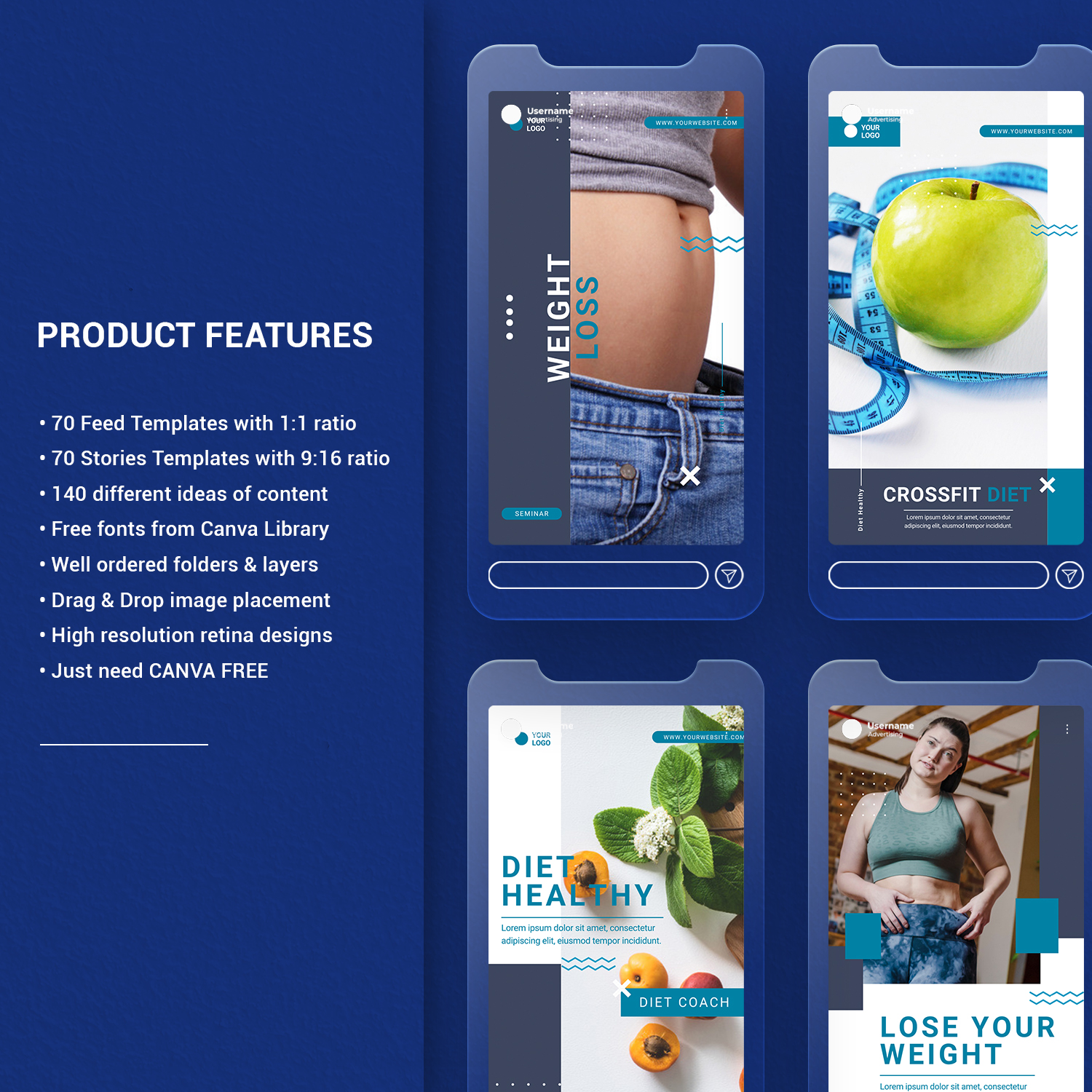 - 70 Story Post Templates: Showcase transformations, daily routines, upcoming launches, and quick wellness insights with visually captivating story templates.