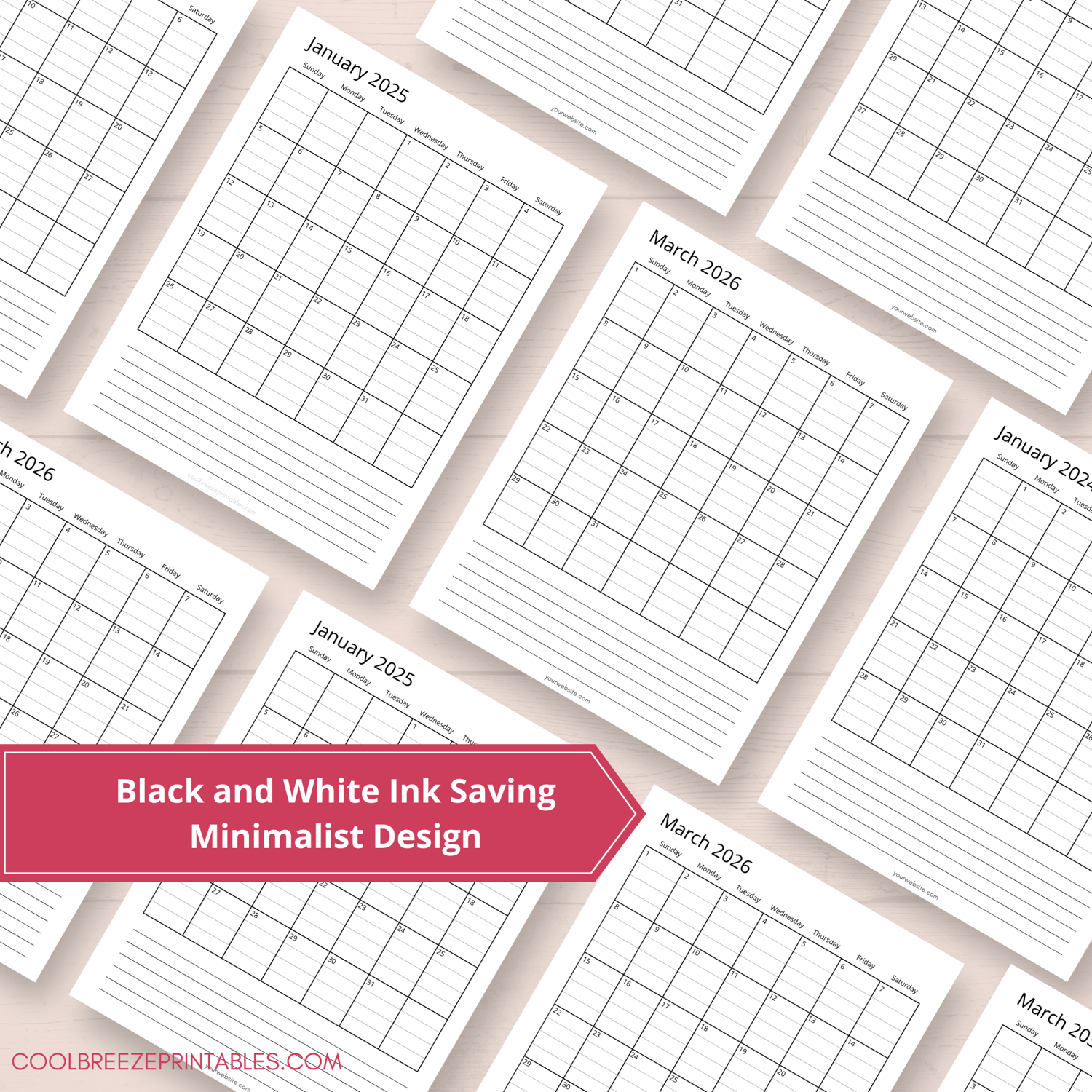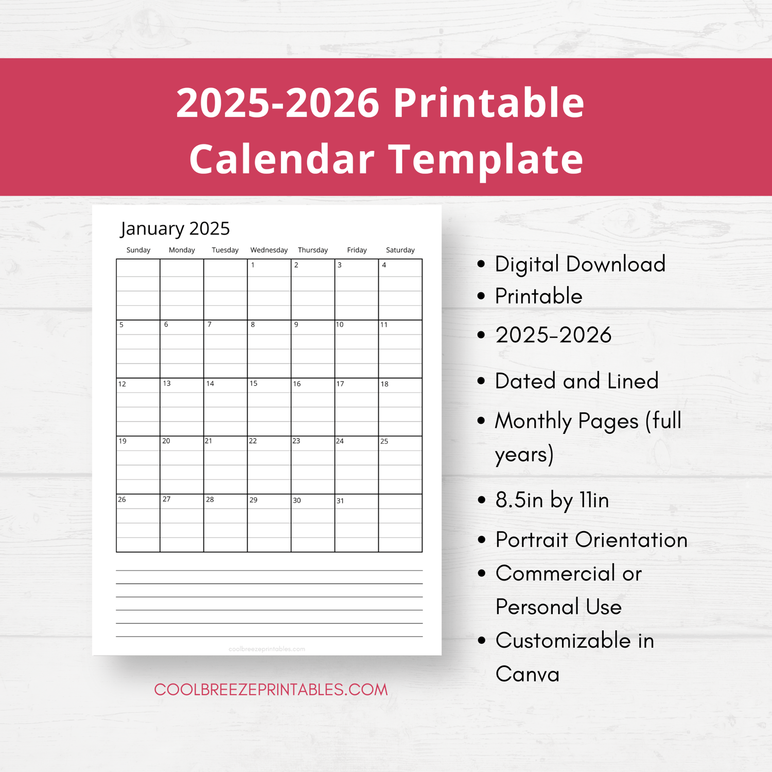 This digital product is a completely editable 2025-2026 Dated and Lined Canva Monthly Calendar Template Pack.