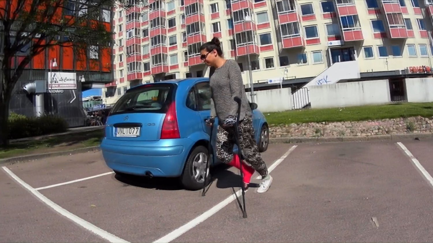 Penelope sits in the car with her red term short leg cast on the outside.She jumps on one leg and take out her crutches from th back seat.We follow ger when she crutching along the street before she enters a food store.