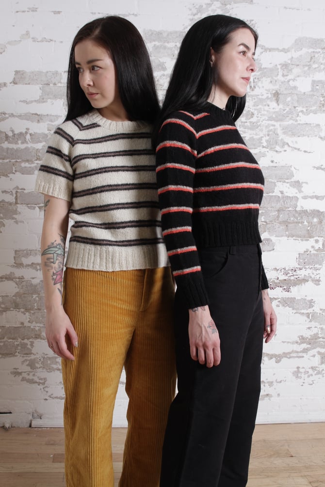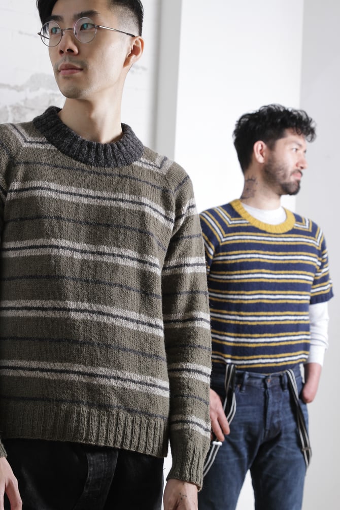 The Kinsan pullover sweater is a classic striped raglan worked from the neck to the hem. This raglan was designed to coordinate with the Ginsan Cardigan. The pattern is written with options for three body lengths, two sleeve lengths and two neck variations to choose from. Choose a stripe sequence from the pattern or make your own!