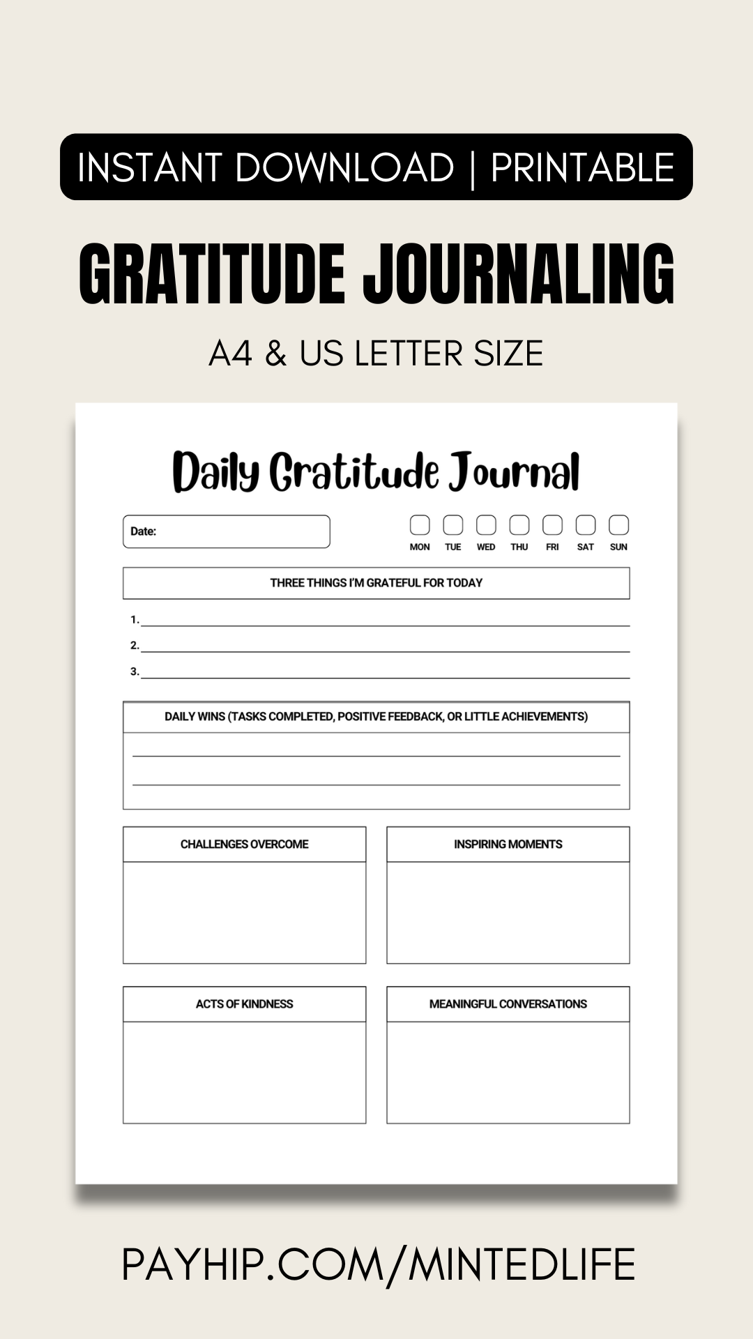 This is a printable daily gratitude journal. Just download, print, and get started right away!