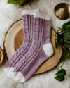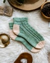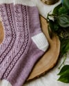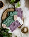 What is more resilient than a blade of meadow grass in spring? The softness of plants gives them the flexibility to be resilient to wind and changes. Inspired by plant life, this pattern is a gentle, breezy lace sock in three sizes, with mix and match options of foldover picot cuff, half twisted rib, and shortie or full length options.