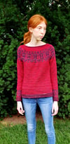 Taunton is a top-down, pullover sweater with gentle waist shaping that gives way to a slight A-line look. It is knit in-the-round with a fair isle pattern on both the yoke and sleeves. Short rows are used to shape the neckline after the fair isle yoke pattern is completed. A combination of garter and simple slip stitches adorns the neckband, cuffs and bottom band making for a unique edging on the sweater.