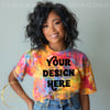 Yellow, Red, Blue Sunburst Tie Dye T-shirt African American Woman Mockup Digital Download with Gray Background, Design Mocks, Tie Dye T-shirts