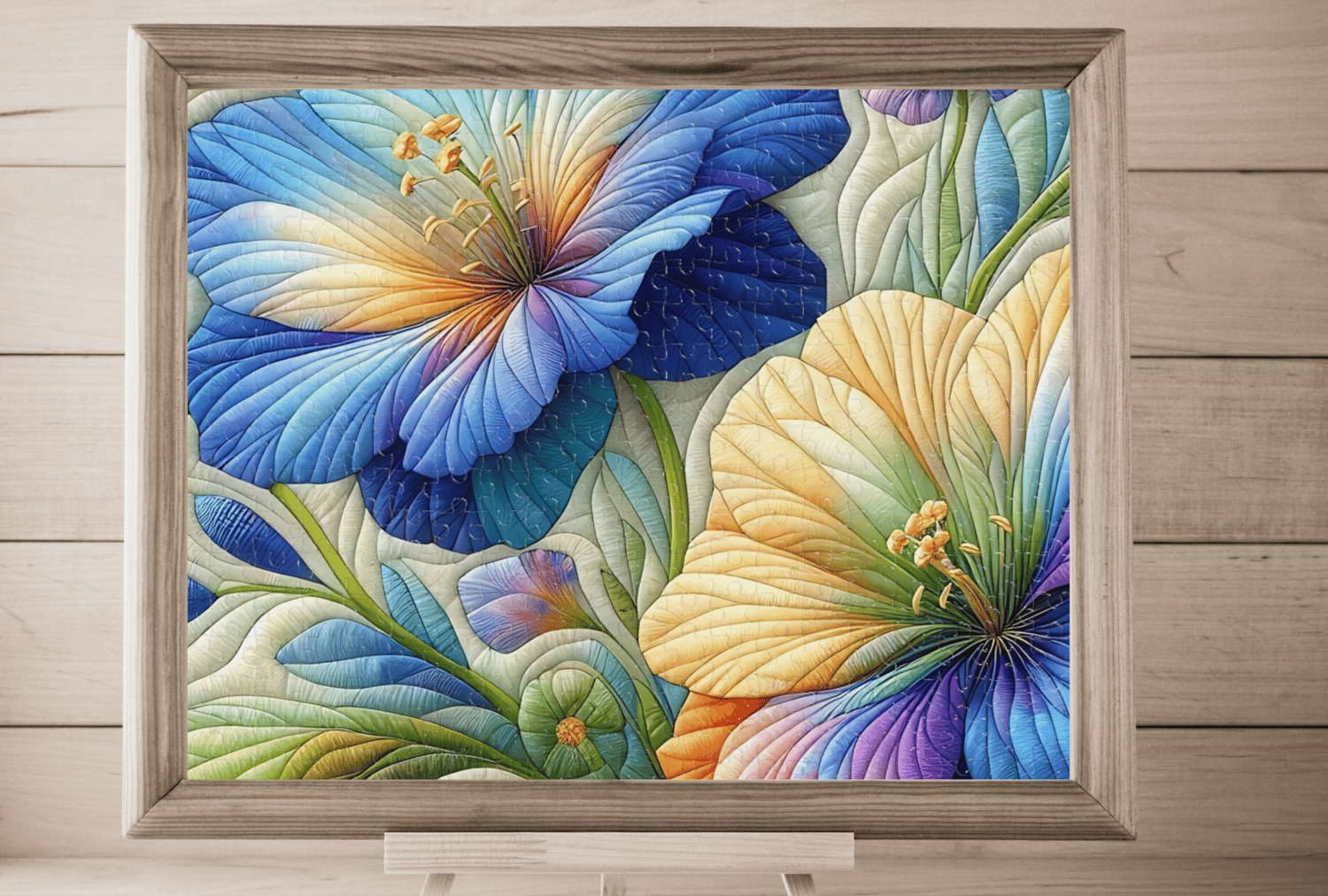 Textured details that mimic the fine stitching of a quilt add depth and realism to the puzzle, inviting you to touch and feel the imagined softness of the fabric. Perfect for hours of meditative focus or as a group activity that promotes teamwork and patience, "Blossoming Splendor" is more than a puzzle—it's an art piece that comes to life with your every move.