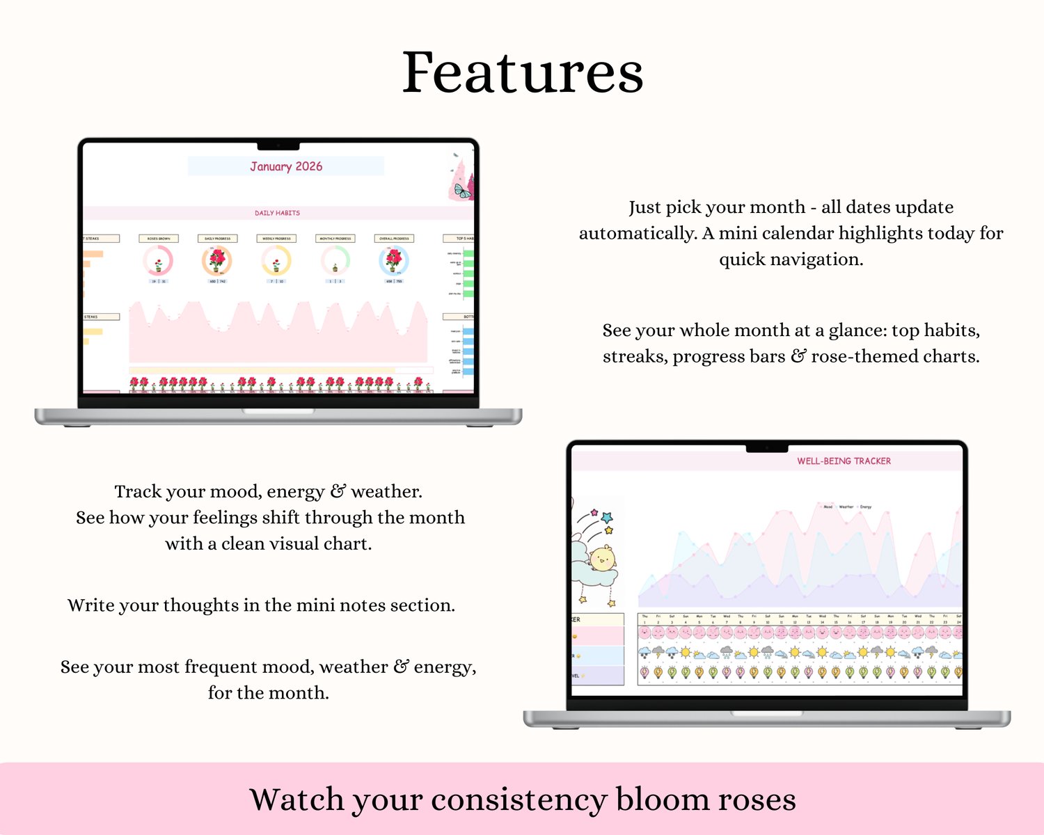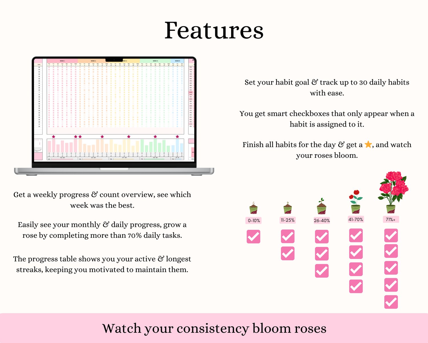 If you enjoy seeing progress, staying organized, and feeling motivated without pressure and like roses, this habit tracker is made for you.