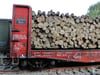 CB&Q bulkhead flat car 95126. BLT 2-63. Kadee whisker couplers, Kadee flat back wheels, prototypical brake wheel, weathered floor, weathered underframe, wooden under floor, hand weathered Chooch log load, wheel end splash, routing tags, chalk marks, painted air hose, painted glad hands