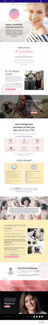 The Cycle Solution landing page is designed for wellness companies focused on optimizing hormonal health for women. This female-forward template features an inviting welcome message, an introduction to Megan Cooper, the founder, and a call-to-action for joining the community.