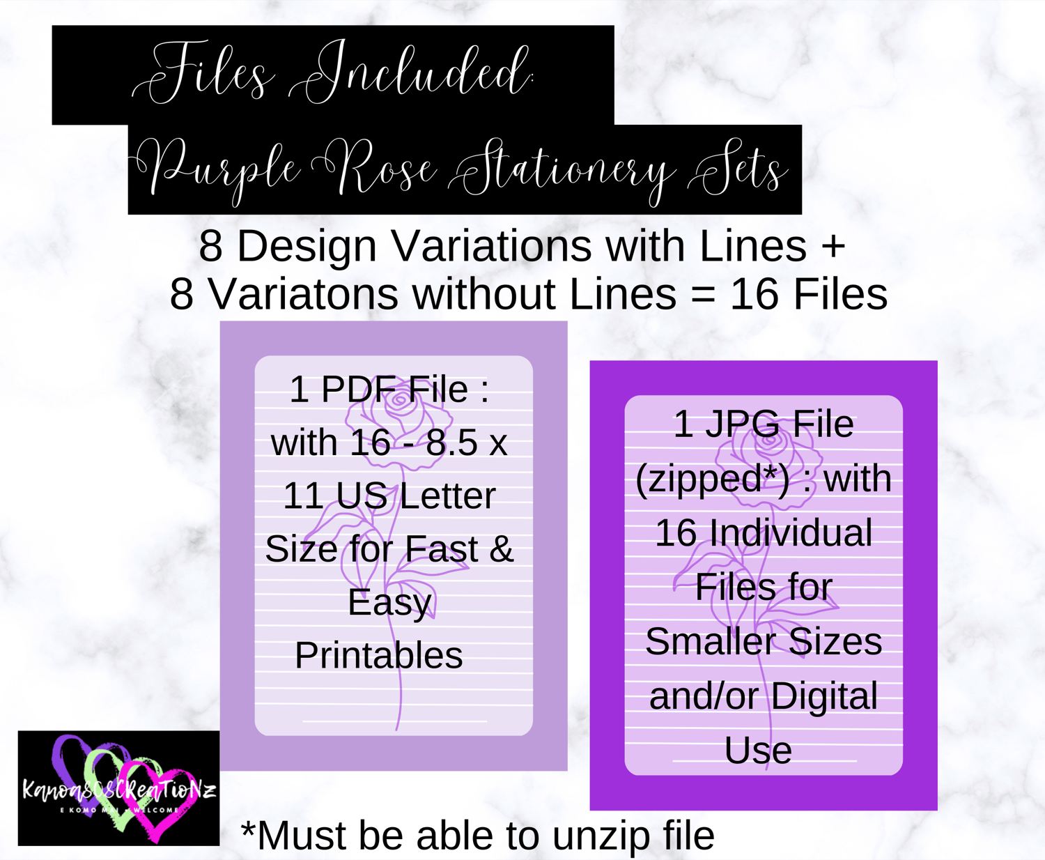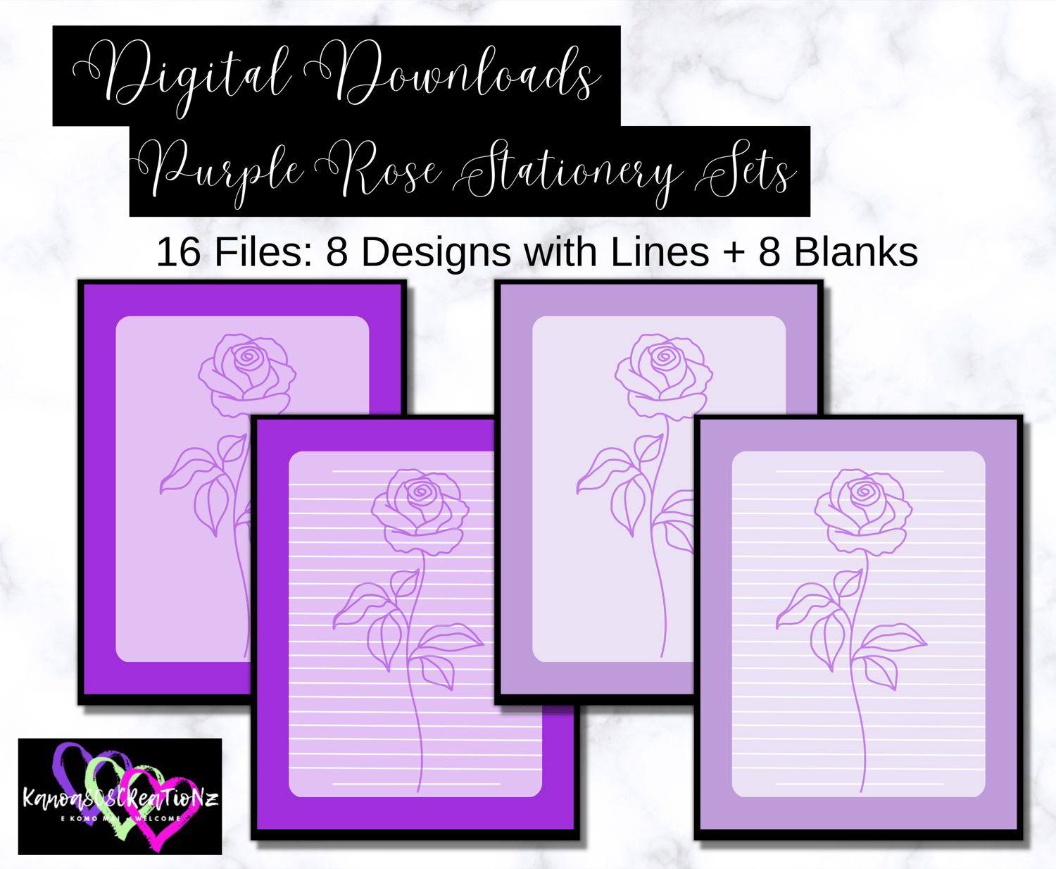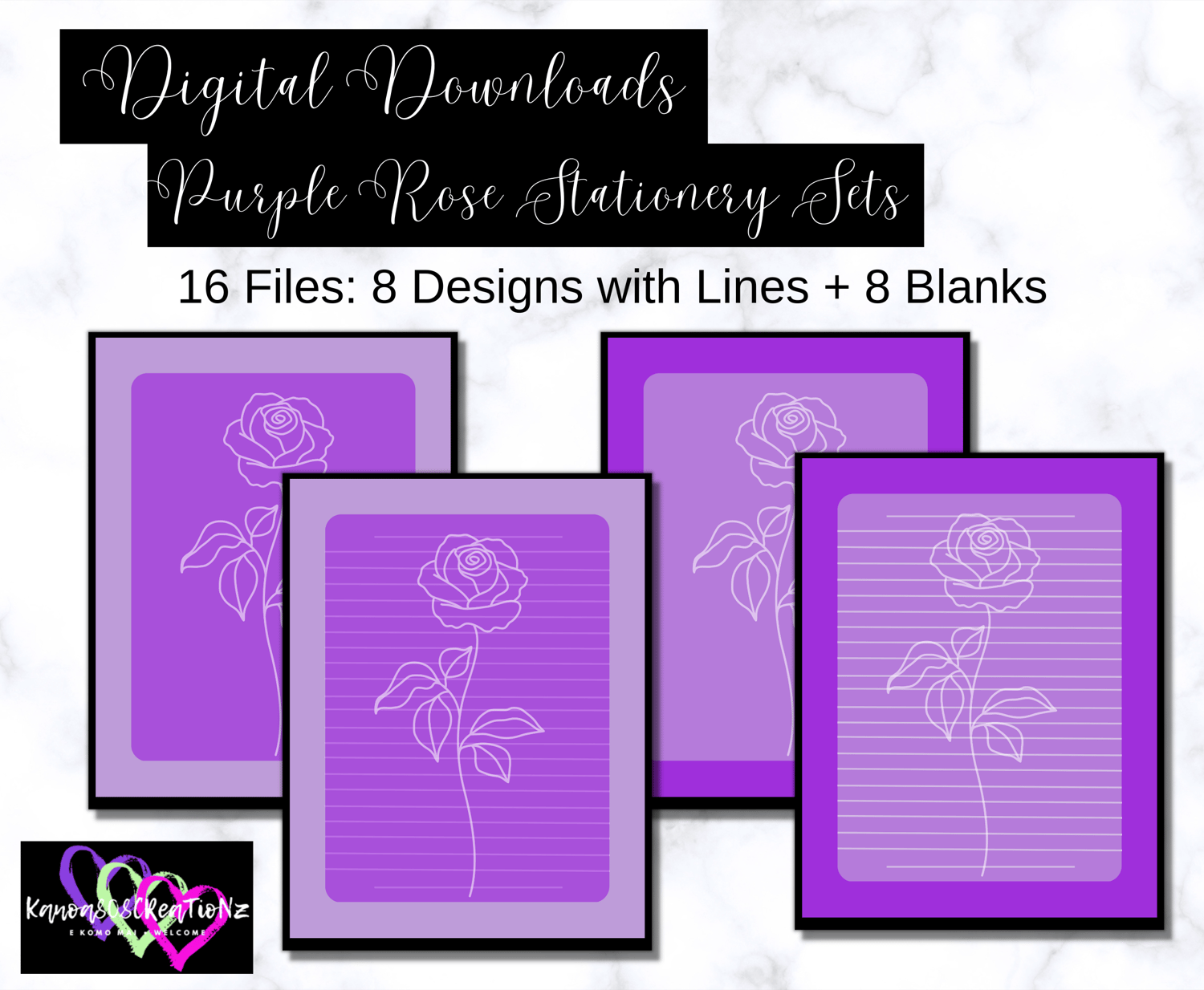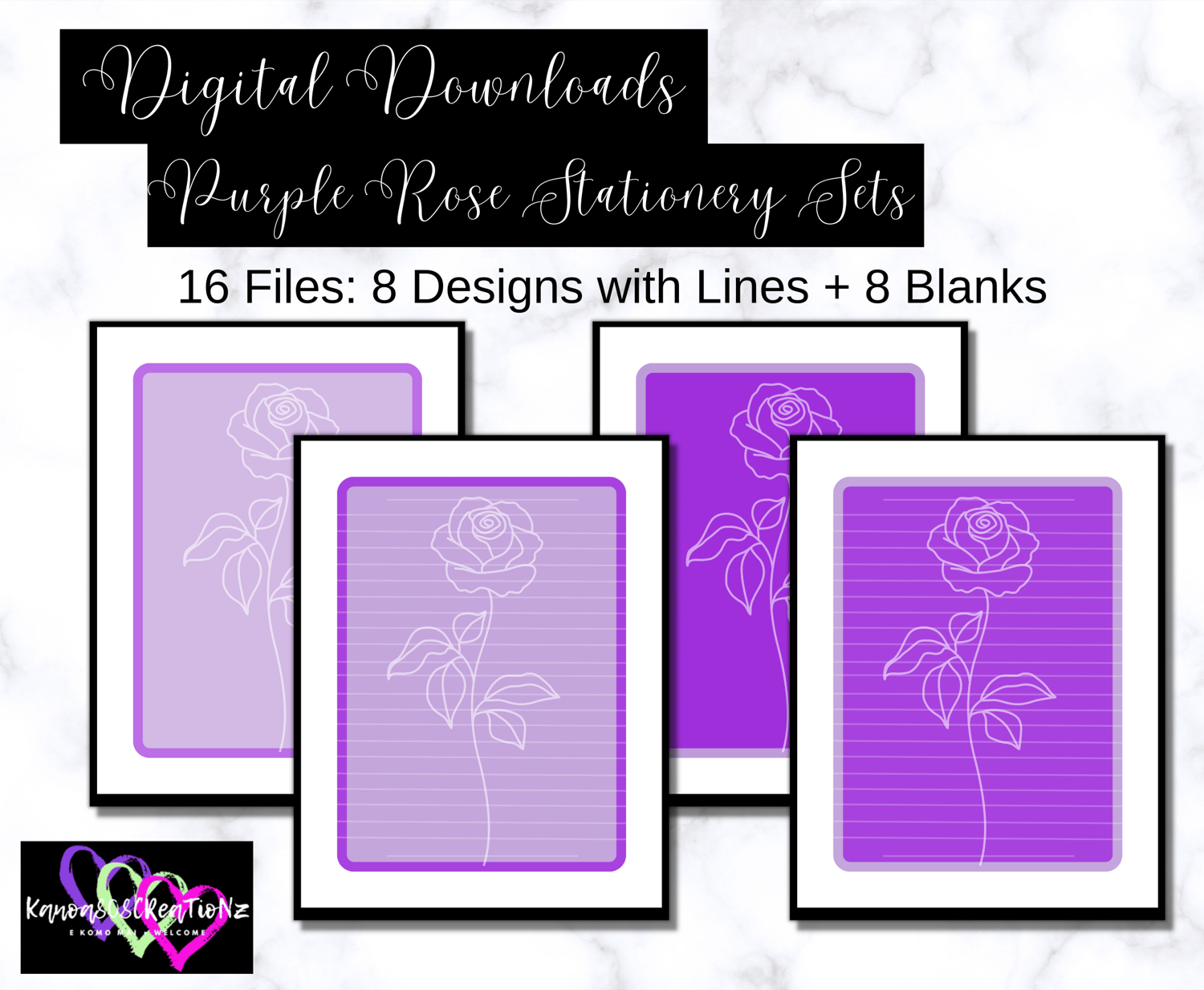 16 Digital Downloadable & Printable Files: Purple Roses Stationery Set
