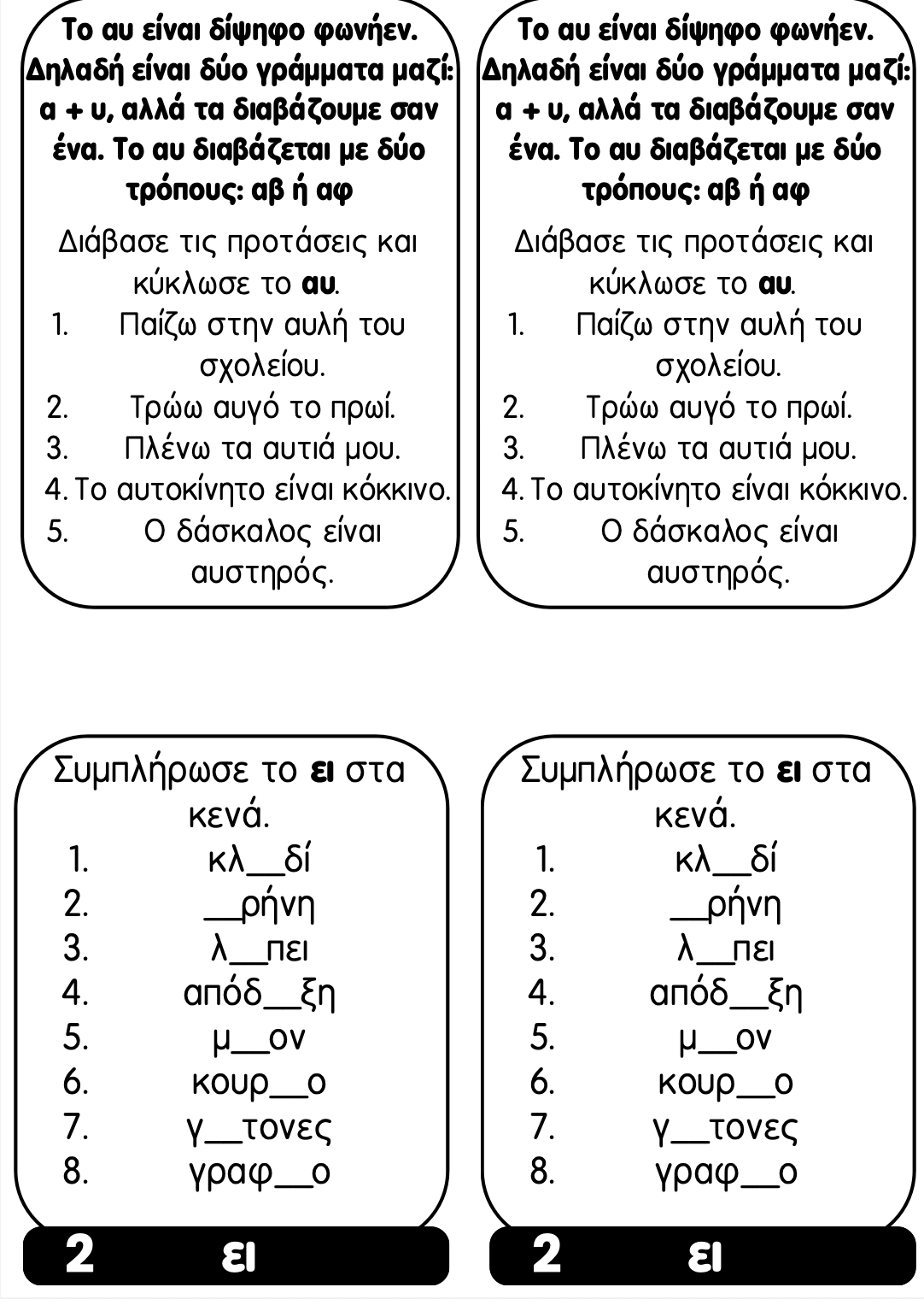 - Σωστή ανάγνωση και προφορά: Θα εξασκηθούν στην ορθή ανάγνωση λέξεων που περιέχουν δίψηφα φωνήεντα. Αυτό περιλαμβάνει και τις διπλές προφορές του "ευ" και "αυ".