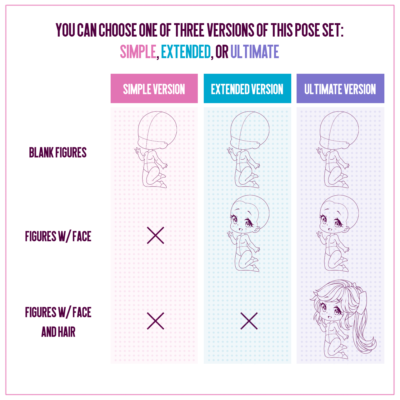 The fourth volume of my chibi girl figures for Procreate is filled with seriously lovely and cheerful poses with extra fine linework designed specifically for cute and kawaii art styles! It also contains several niche poses that can be particularly helpful if you are struggling with an art block and want to try out new themes and ideas. Tested by adoptable makers, tattoo artists, illustrators and sticker designers, these bases are not only a fun learning resource, but also great time savers that can help you streamline your art business, be it drawing commissions, T-shirt design, or handcrafting!