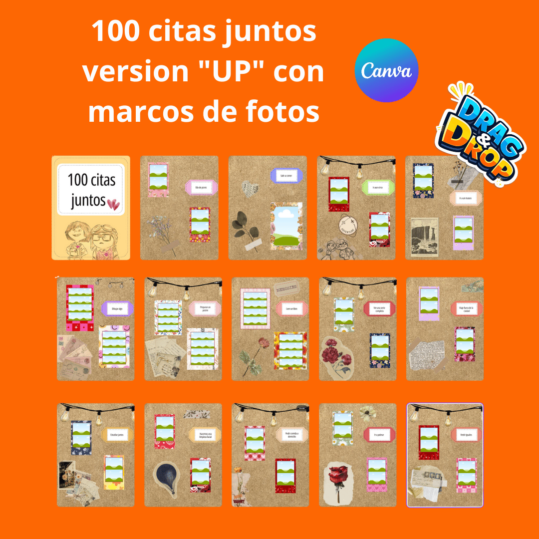 Este set incluye 100 citas románticas inspiradas en la versión UP, acompañadas de marcos de fotos editables tipo drag & drop (arrastrar y soltar) para capturar cada recuerdo especial 📸💑