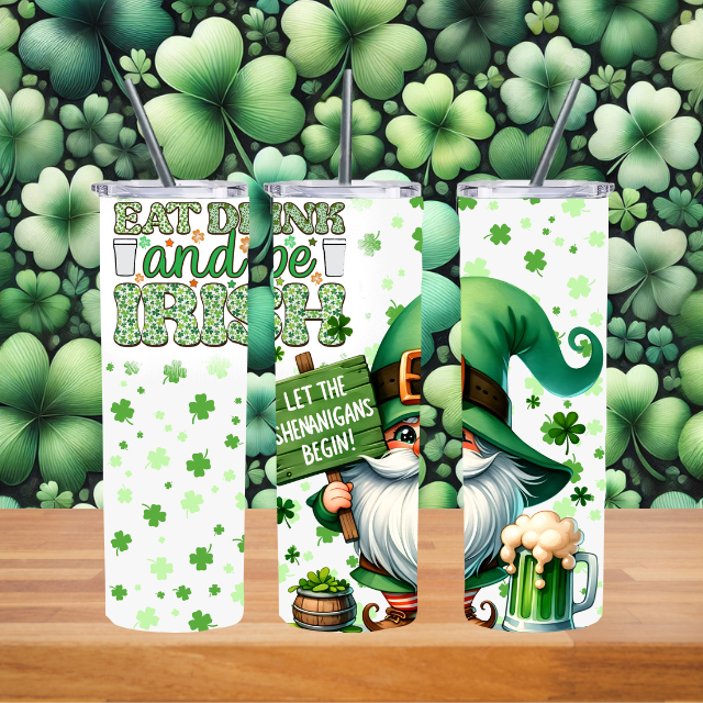 St. Patrick’s Day Tumbler – "Eat, Drink, and Be Irish" with Gnome Design