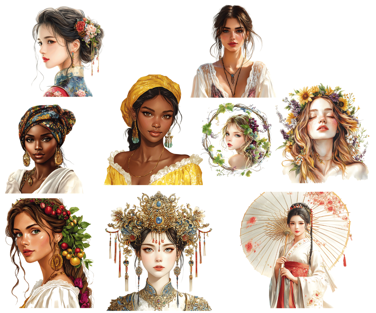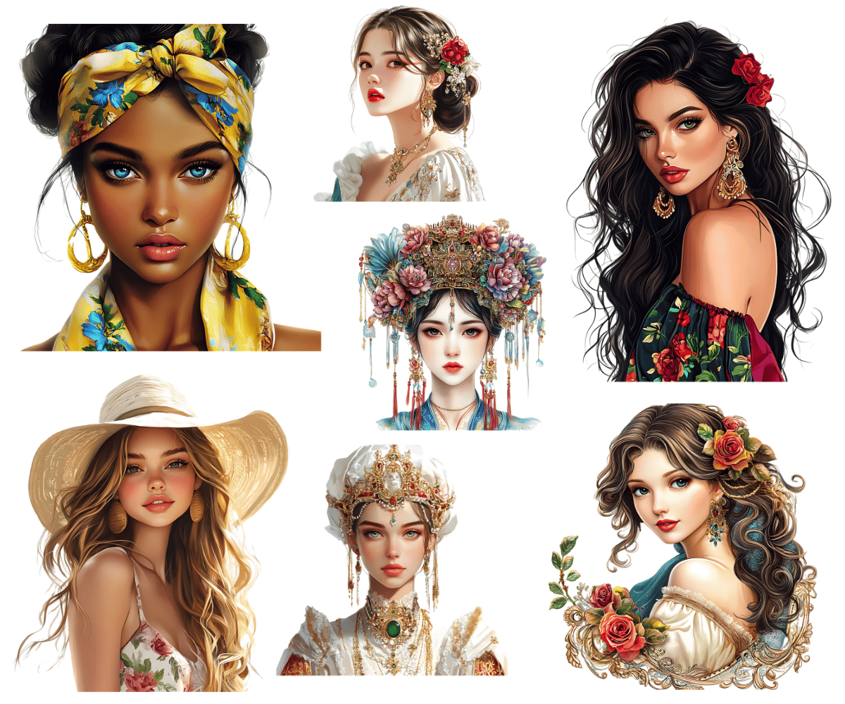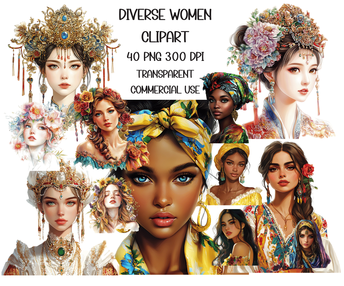 Elevate your crafting projects with our Diverse Women Clipart. Perfect for instant download and sublimation design. Clipart includes elegantly styled elements suitable for crafting projects in gorgeous rich tones evocative of the beautiful aesthetic. Ideal for digital art, printable clipart, and crafting, this set is a must-have for creating charming arts and crafts designs. In fact, cut them out and place them on your planners to make for an extra special gift for an organizer.