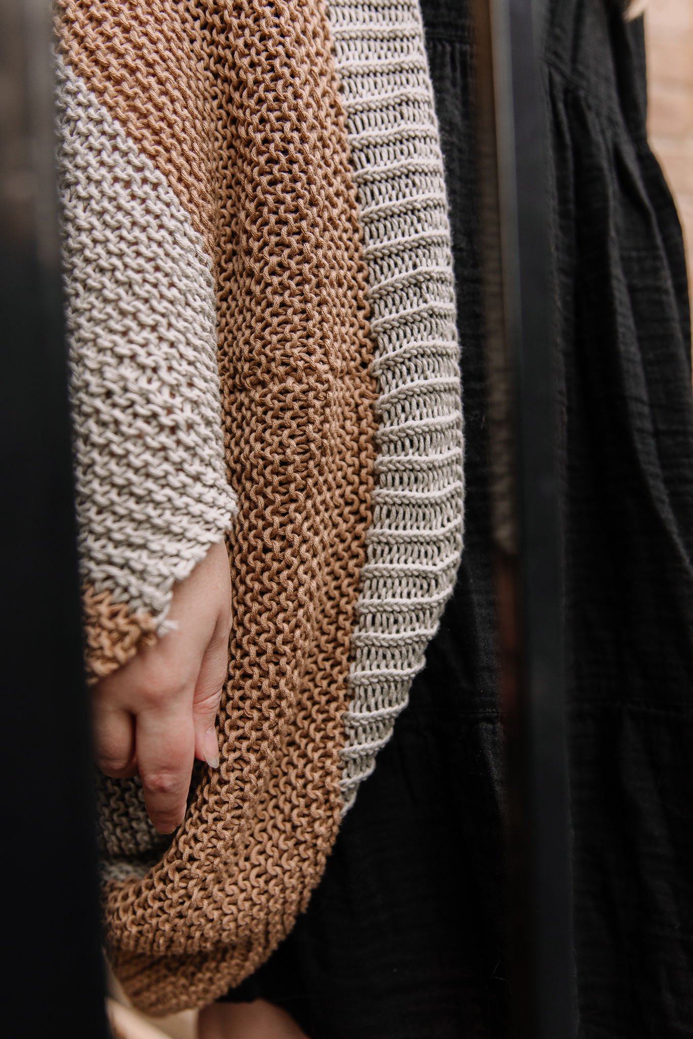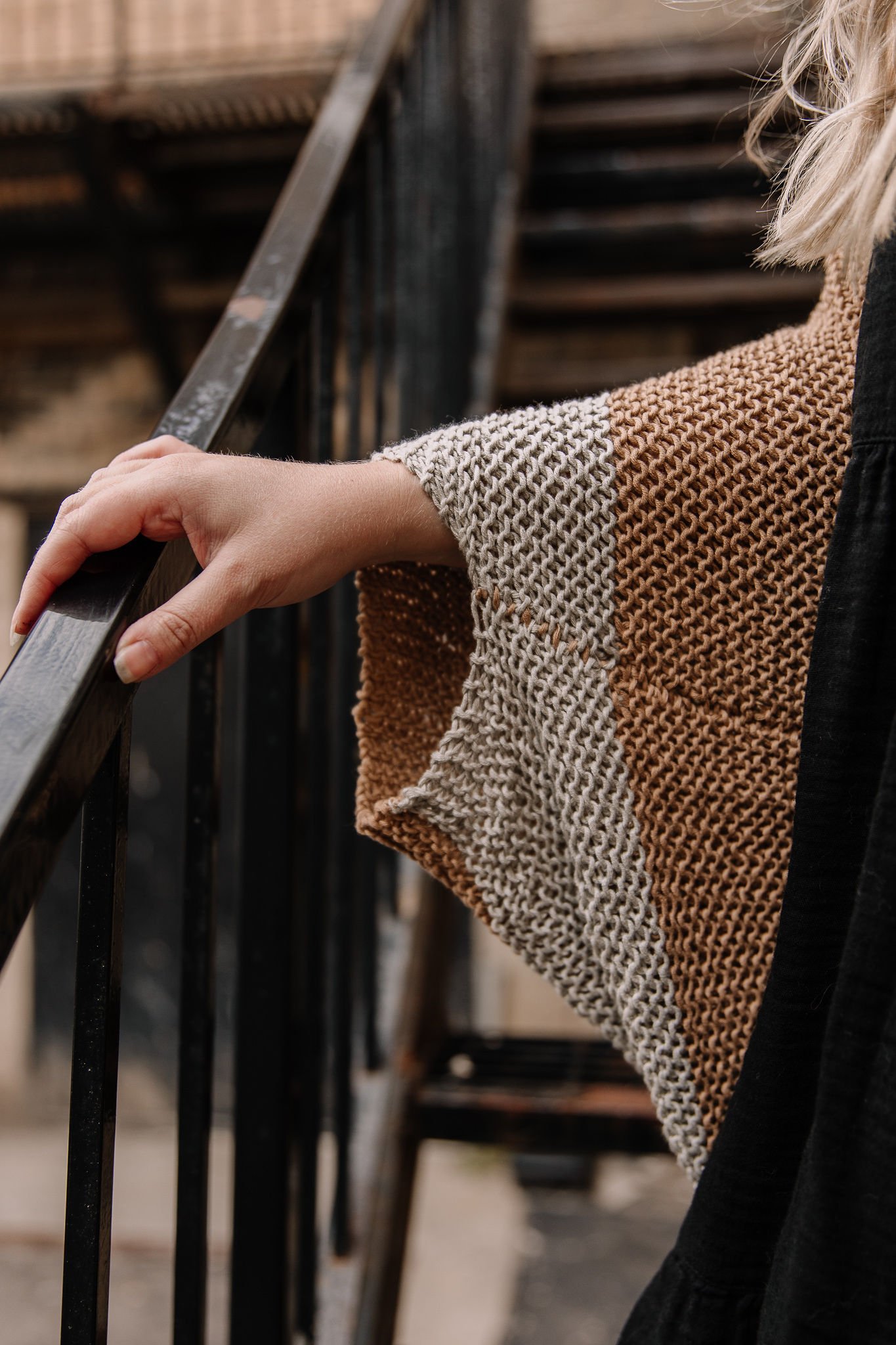 This is the sweater you’ll be reaching for in both the cool seasons and when it’s warm. Knit in a rectangular panel that will later be seamed, this sweater incorporates the light and breezy garter stitch and finishes with a twisted rib. This easy level sweater will be flying off your needles in no time!