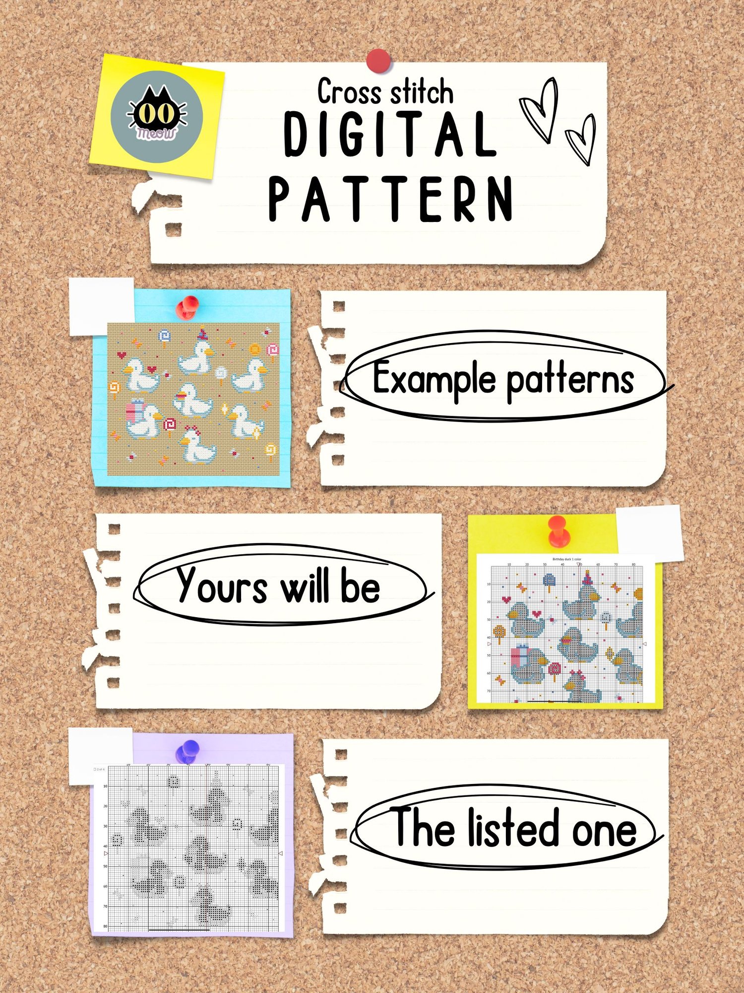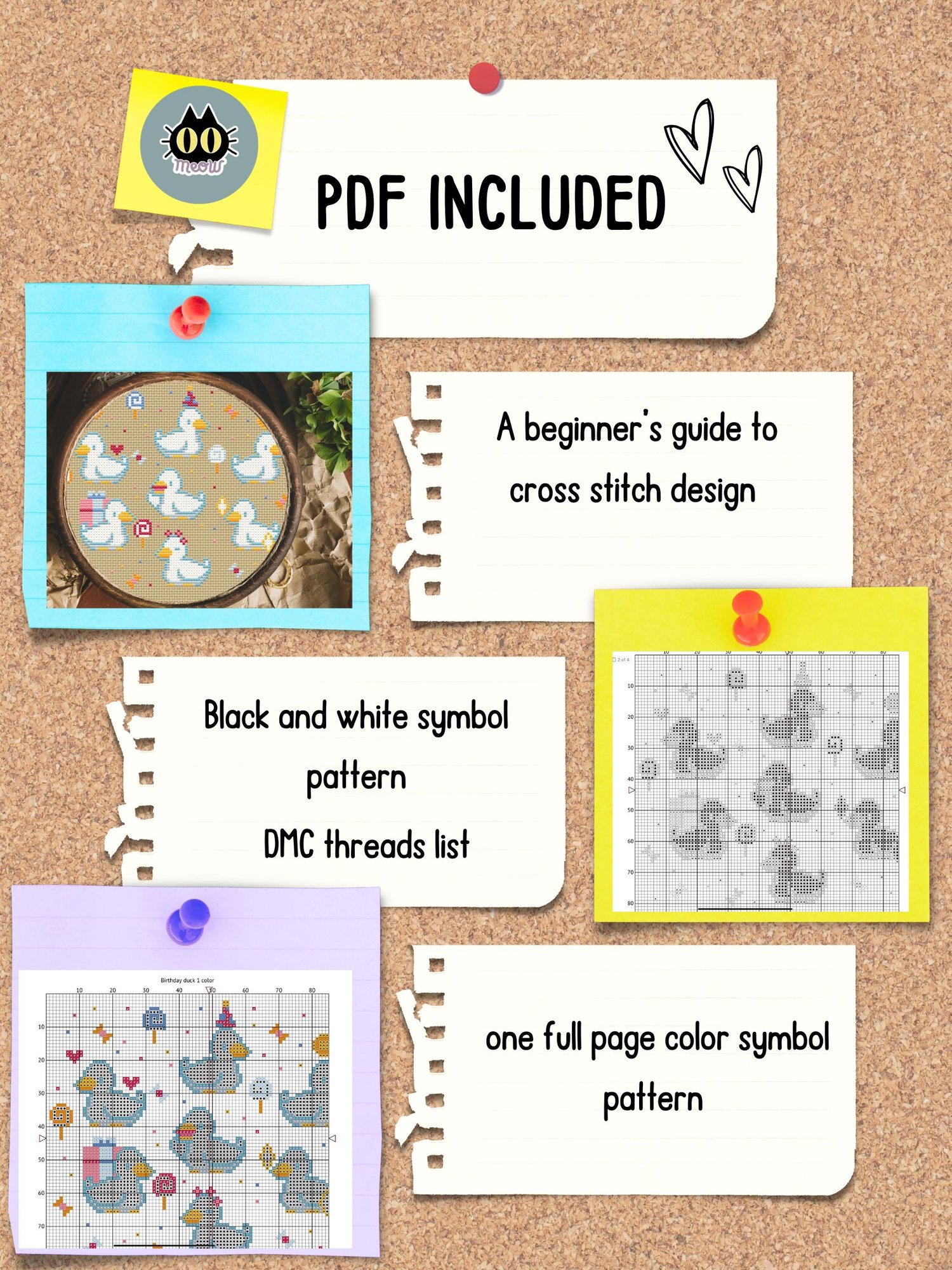 - 4Pdf files with detailed instructions of the cross stitch design. Floss list, symbol