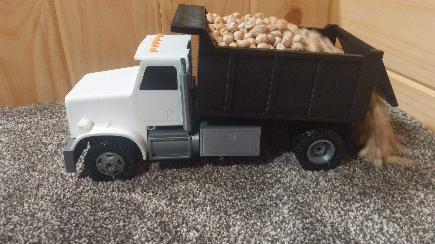 The dump truck isn’t just for show — it can haul small items like sticks, rocks, or even garbanzo beans, making playtime or demonstration builds extra fun.