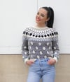 Commençant avec une encolure bordée de nopes, Batignolles peut être tricoté soit en version gilet soit en pull. Il est tricoté en partant de l’encolure, avec des augmentations pour former les épaules. L’empiècement circulaire (yoke) est ensuite divisé pour former les manches et le corps avec de gros pois contrastants, le tout en utilisant la technique du Jacquard Fair Isle. Les manches généreuses lui donnent un faux air de chemisier blousant, resserré aux poignets et se terminant à nouveau par un rang de petites nopes. Le corps est tricoté droit, il pourra être rallongé ou raccourci selon vos préférences.