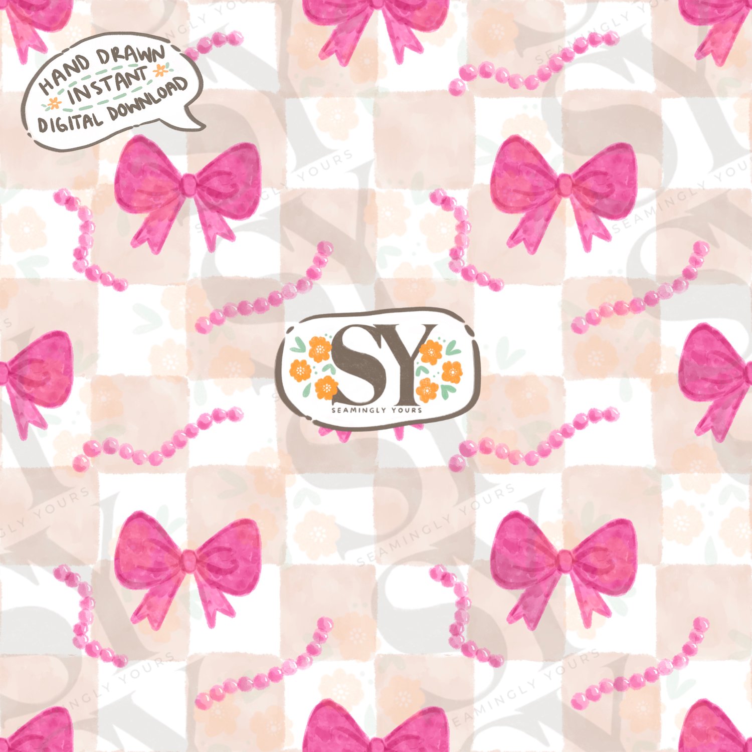 Pink Watercolor Bows and Pearls Checkered Print | Hand-drawn Seamless Pattern | Digital Download for Crafts & Sublimation | Commercial Use for Small Business