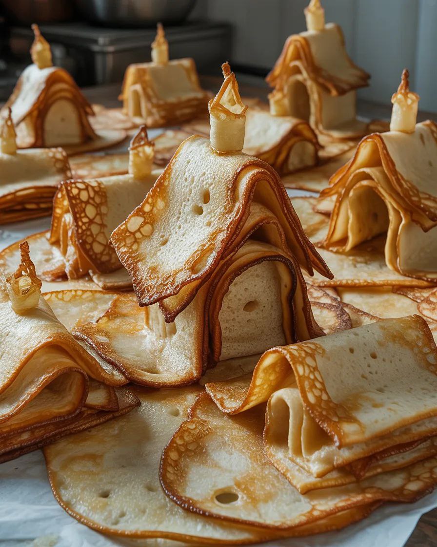 Step into a whimsical world where culinary art meets architectural detail with an ultra-realistic miniature village crafted entirely from thin, golden Russian blini. Each building showcases lace-like folds, crispy burnt edges, and textured dough with tiny bubbles and a subtle oily sheen, creating a visually striking and tactilely convincing scene. Captured in natural kitchen lighting with high-resolution detail, this composition balances messy charm with meticulous realism. Perfect for creators seeking unique, high-impact, and imaginative visuals that blend food artistry with professional-level photography.