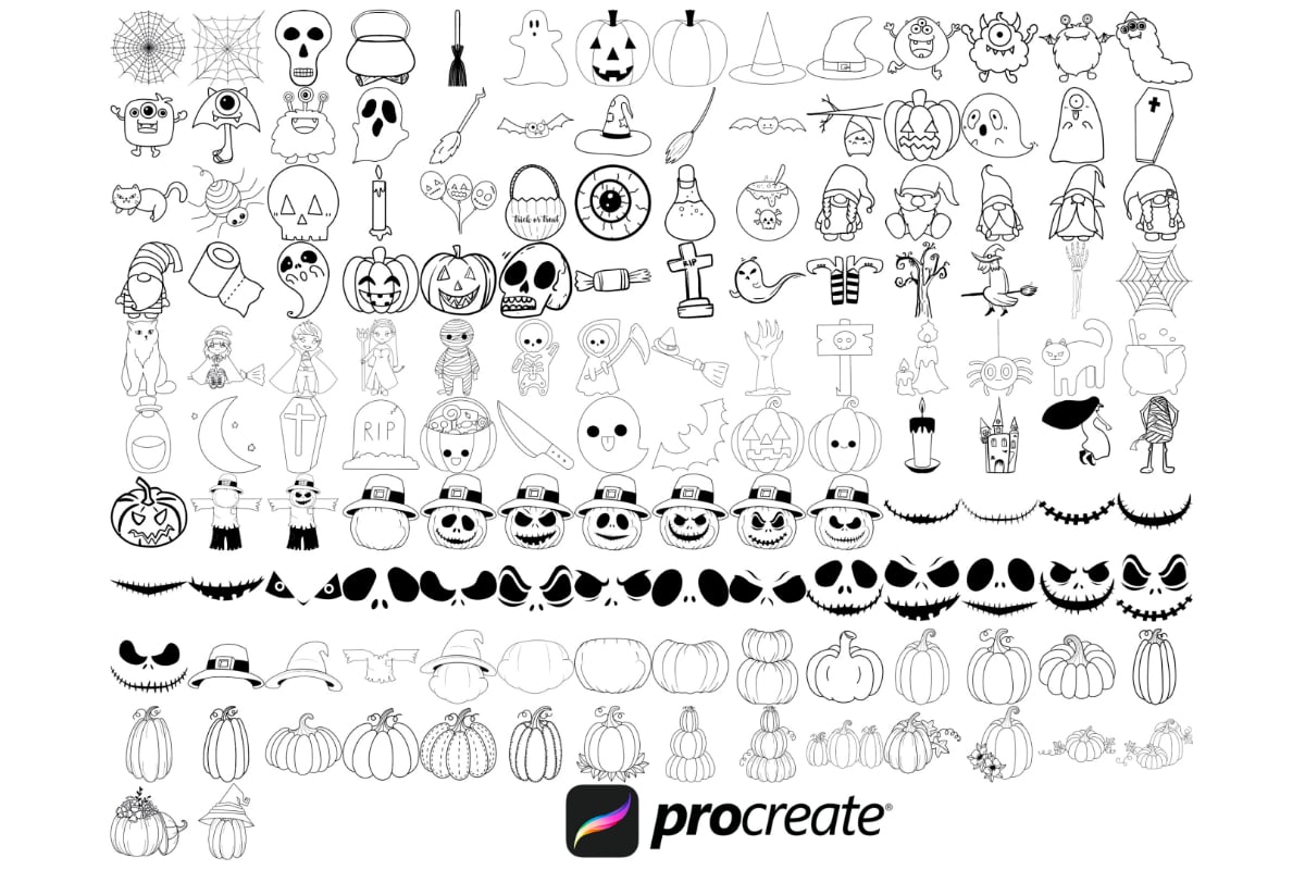 Halloween Elements Outlines Set 13 Procreate Brush Stamps, 142 Halloween Element Stamps