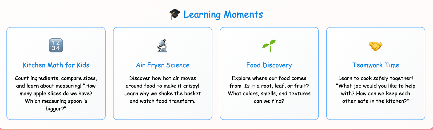 ✨ Learning moments, tips, and safety reminders included for little chefs